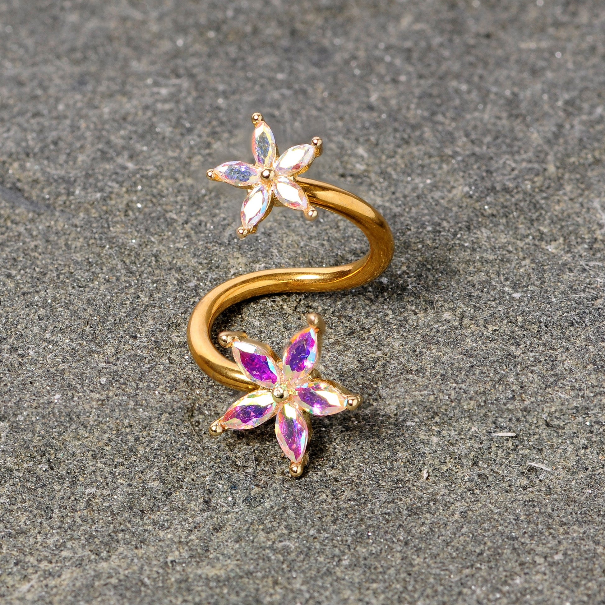 These flowers are sure to make you feel like a star when you're wearing this 14 gauge spiral body ring! It's made with a 10mm gold tone plated over 316L surgical grade stainless steel spiral curved barbell. Each of the ends features a five-petaled flower charm composed entirely of aurora gems. This flower twister body jewelry can go in multiple piercings including your lip, navel, eyebrow, and some cartilage piercings like the helix too! That's a flower with some mighty star power!Specifications
