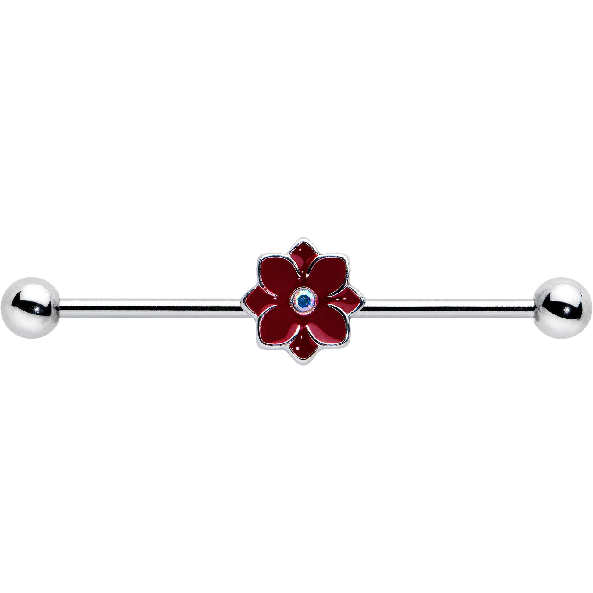 Add a festive touch to your look with this 14 gauge helix barbell! It's made with a 1 1/2" durable 316L surgical grade stainless steel straight barbell with 5mm ball ends. It features a poinsettia flower charm with the petals inlaid in deep burgundy red and an aurora gem center. You can even slide it up and down the length of the barbell for the perfect look! With such glamorous styling and thoughtful details, this is one barbell earring that is sure to wow you!Specifications