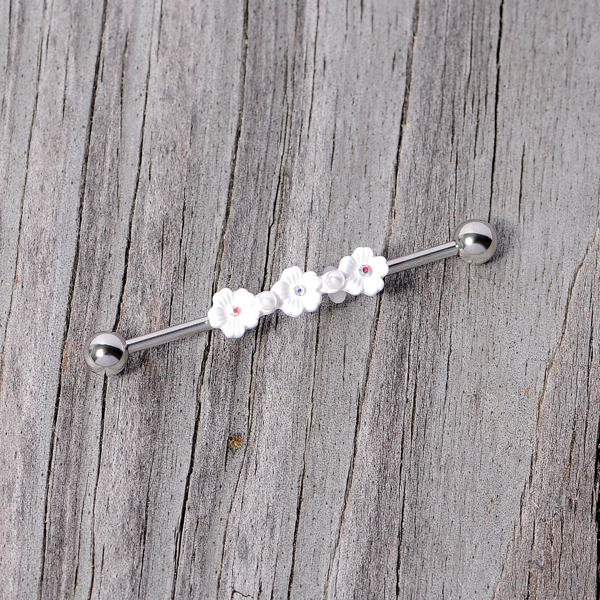If you're looking for something fun and floral to shake off weary winter then you will love this 14 gauge industrial jewelry with tons of spring style! Made with a 1 1/2" durable 316L surgical grade stainless steel straight barbell, this industrial earring features a moveable white flower charm set with white orbs and aurora gems that will always look as fresh as a spring morning!Specifications