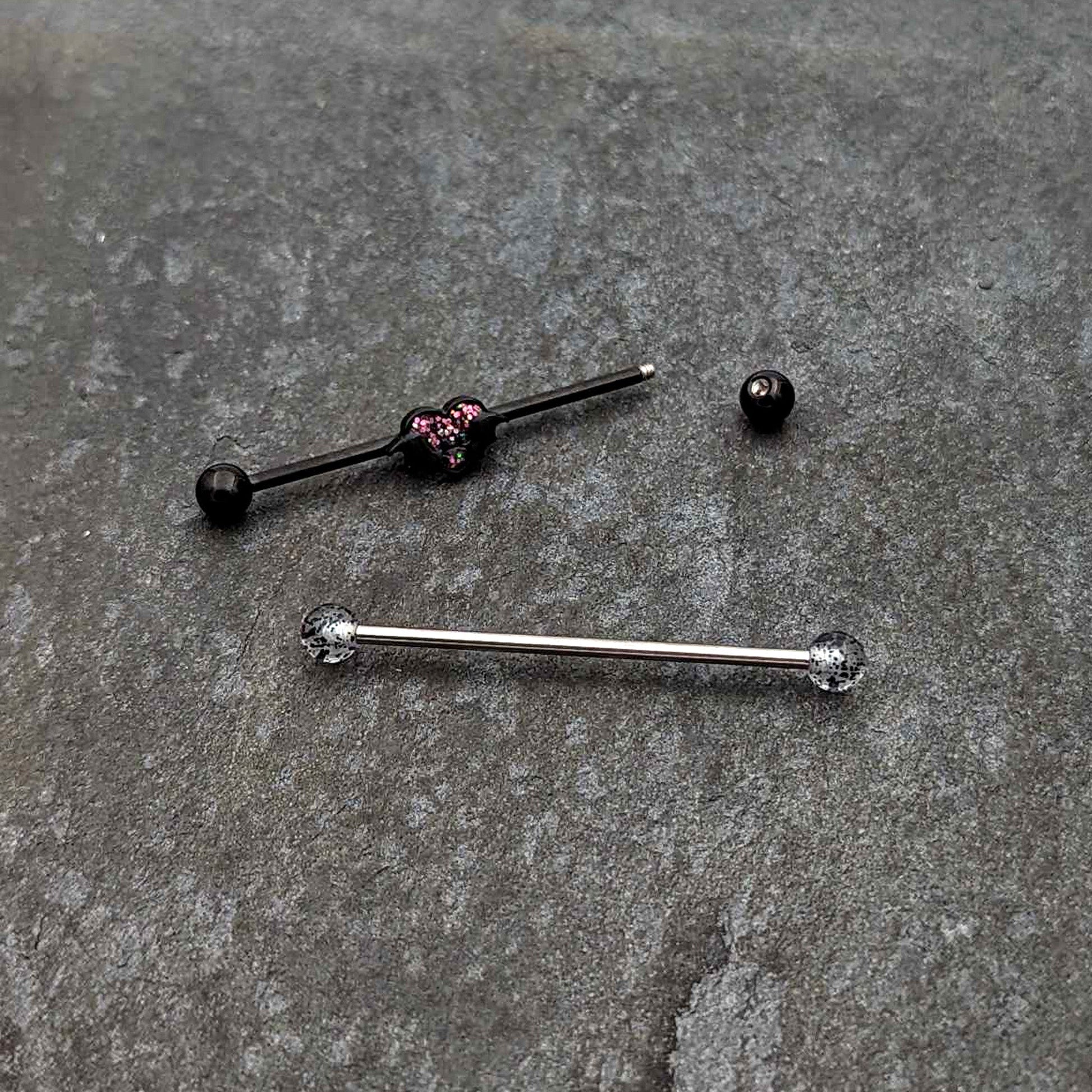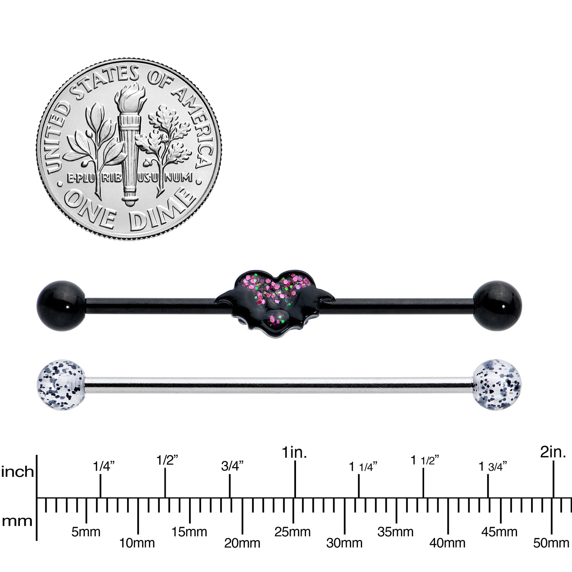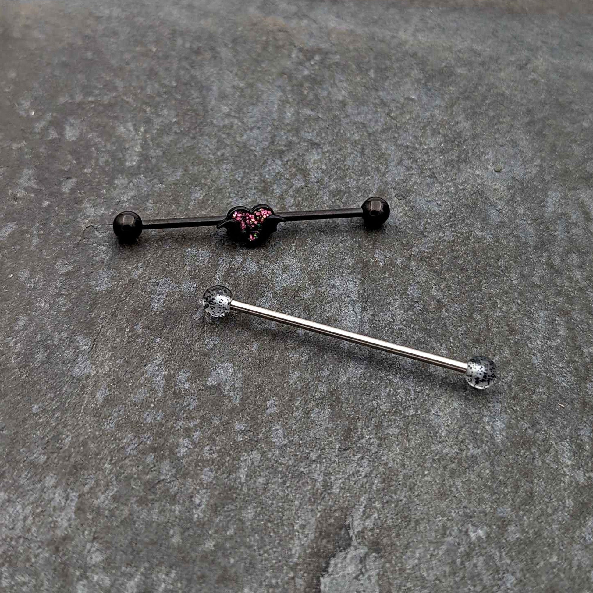 This Halloween, let a bat steal your heart with these 14 gauge helix barbells! One is made with a 1 1/2" durable 316L surgical grade stainless steel straight barbell. It features 5mm clear acrylic ball ends, with glitter set inside for subtle style. The other is made with a 1 1/2" black PVD over 316L surgical grade stainless steel straight barbell with 5mm ball ends. It features a floral heart charm, with a flying bat at the bottom. You can even slide the charm up and down the length of the barbell for the perfect look. These barbell earrings are sure to make your heart soar! Sold as a set of two.Specifications