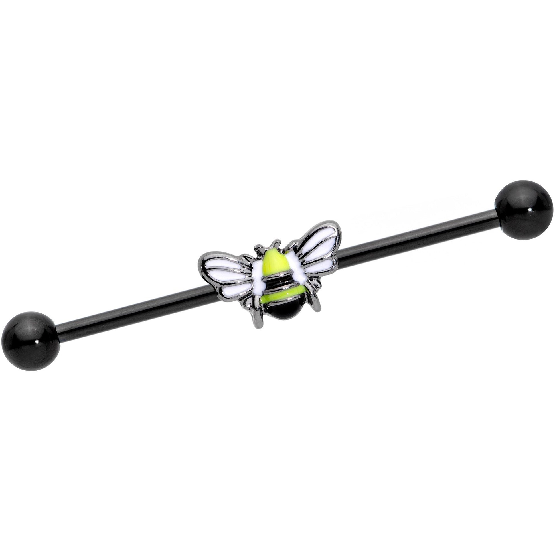 This little bumblebee has found a nice spot to rest on this 14 gauge industrial piercing and he couldn't be happier! The industrial earring is made with a 1 1/2" black PVD over 316L surgical grade stainless steel straight barbell and has 5mm ball ends. It features a charm of our charming little bee, color inlaid with the wings embellished in white and his iconic yellow and black stripes all on display. And should he get a case of wanderlust, he can be slid up and down the length of the barbell to give you both just the look you're after! What a honey of an earring!Specifications