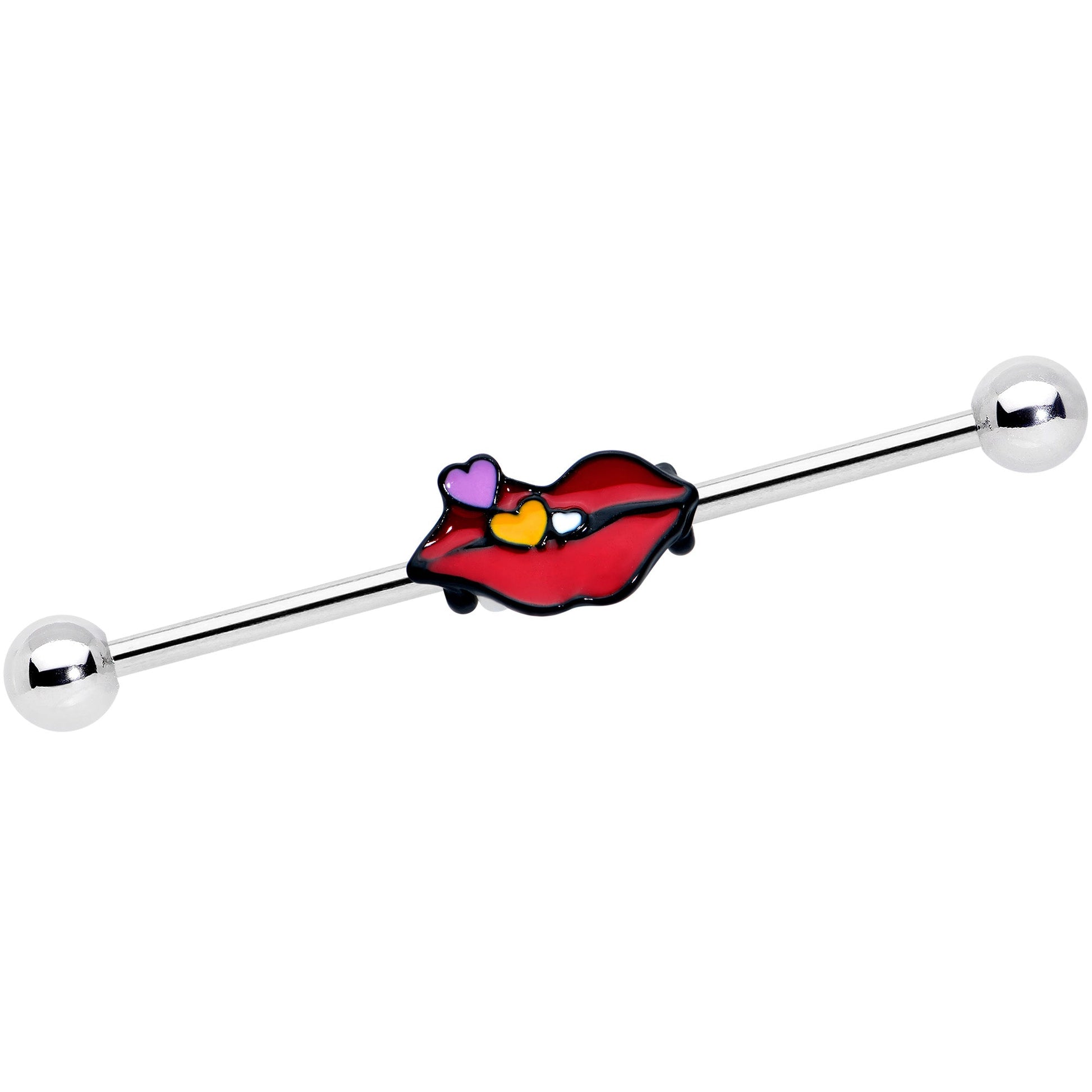 Whether you love Valentine's Day or loathe it, you'll have a look for it with this set of 14 gauge helix barbells! Both are 1 1/2". One is made with a black PVD over 316L surgical grade stainless steel straight barbell and features cone shaped ends for a classic punk rock look. The other is made with a 316L surgical grade stainless steel straight barbell with 5mm ball ends. It features a lips charm, inlaid in red and embellished with tiny hearts in yellow and purple. You can slide the charm up and down the length of the barbell for a look you'll love. Your industrial piercing will be ready to rock for Valentine's Day with these barbell earrings! Sold as a set of two.Specifications