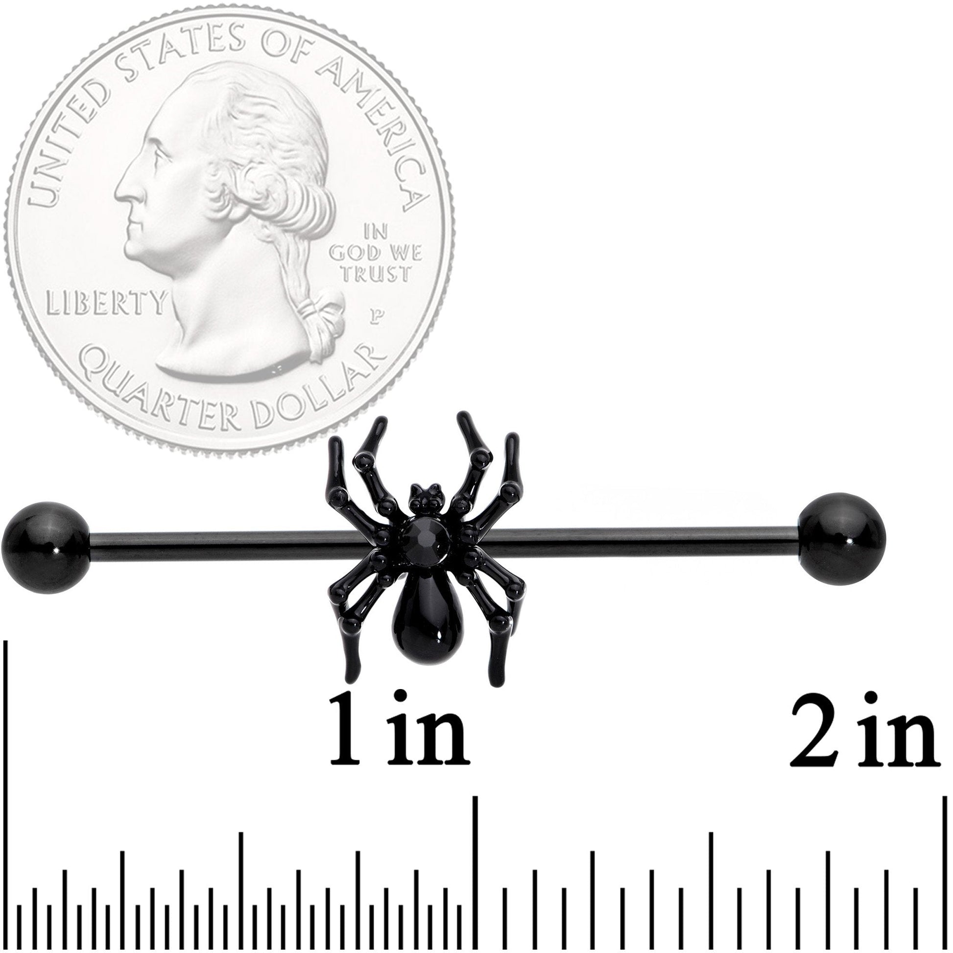 This creepy crawly critter has found a new home on this 14 gauge industrial earring! Made with a 1 1/2" black PVD over 316L surgical grade stainless steel with 5mm ball ends, this barbell features a large black spider. The spider has a black gem set in its thorax, to draw the eye in a way that's subtle but impossible to ignore. And much like a real spider, this one can be slid up and down the length of the barbell to get just the look you want. So let this creepy critter crawl into your ear and spin a web of beauty!Specifications