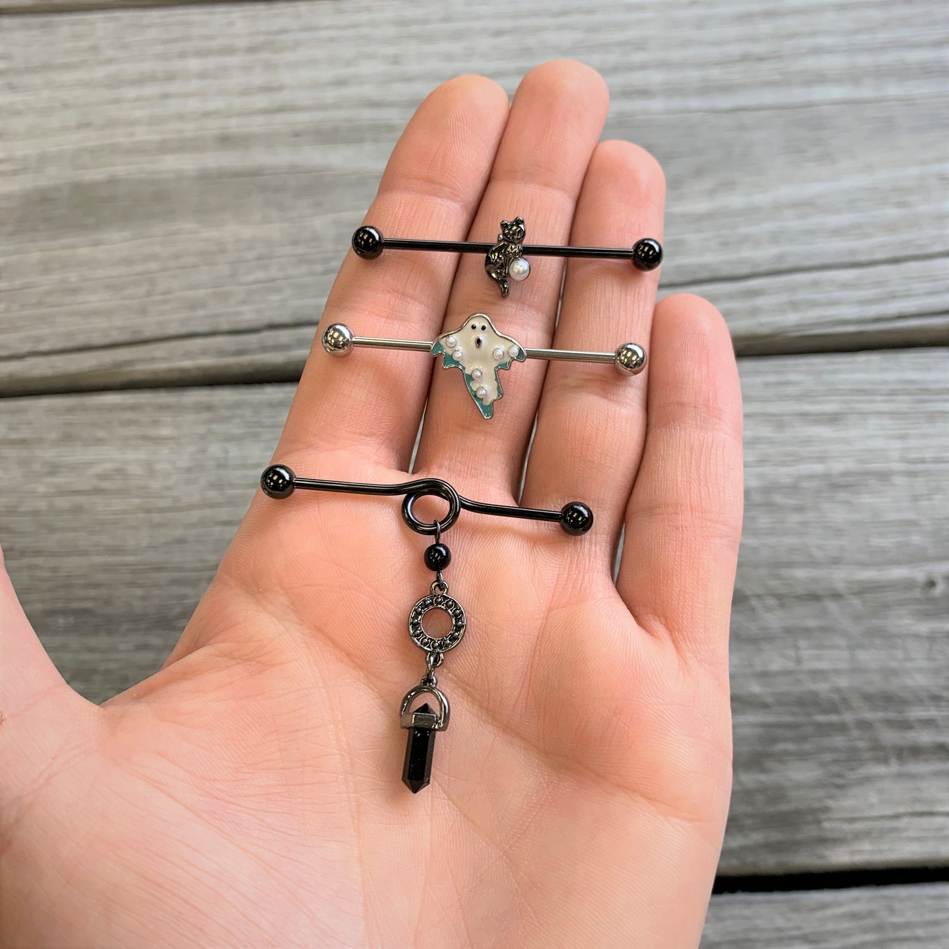 Get ready to get your gothic look on when you wear this all-black 14 gauge industrial jewelry. Made with a 1 1/2" black electroplated over 316L surgical grade stainless steel looped project barbell, this industrial earring features a ring dangle charm with a black gem dangle for spiritual balance and spooky Halloween style.Specifications
