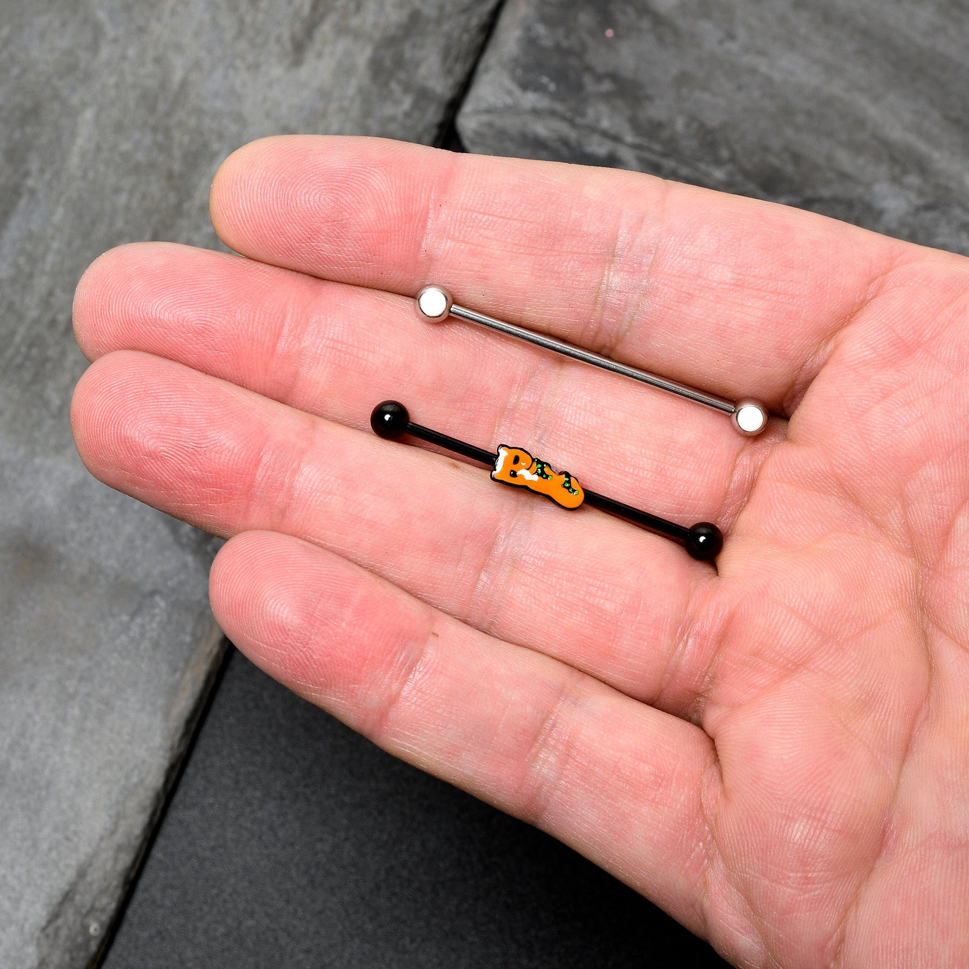 Give your piercings a festive glow-up with these 14 gauge helix barbells! The first is made with a 1 1/2" durable 316L surgical grade stainless steel straight barbell. It features 5mm ball ends which are set with white embellishment that glows in the dark! The second is made with a 1 1/2" black PVD over 316L surgical grade stainless steel straight barbell with a 5mm ball ends. It features an orange "BOO" charm, with jack-o-lanterns as the last two letter. The charm glows in the dark and you can even slide the charm up and down the length of the barbell for the perfect look! You'll have everything you need this Halloween with this set of fun and festive Halloween barbell earrings! Sold as a set of two.Specifications
