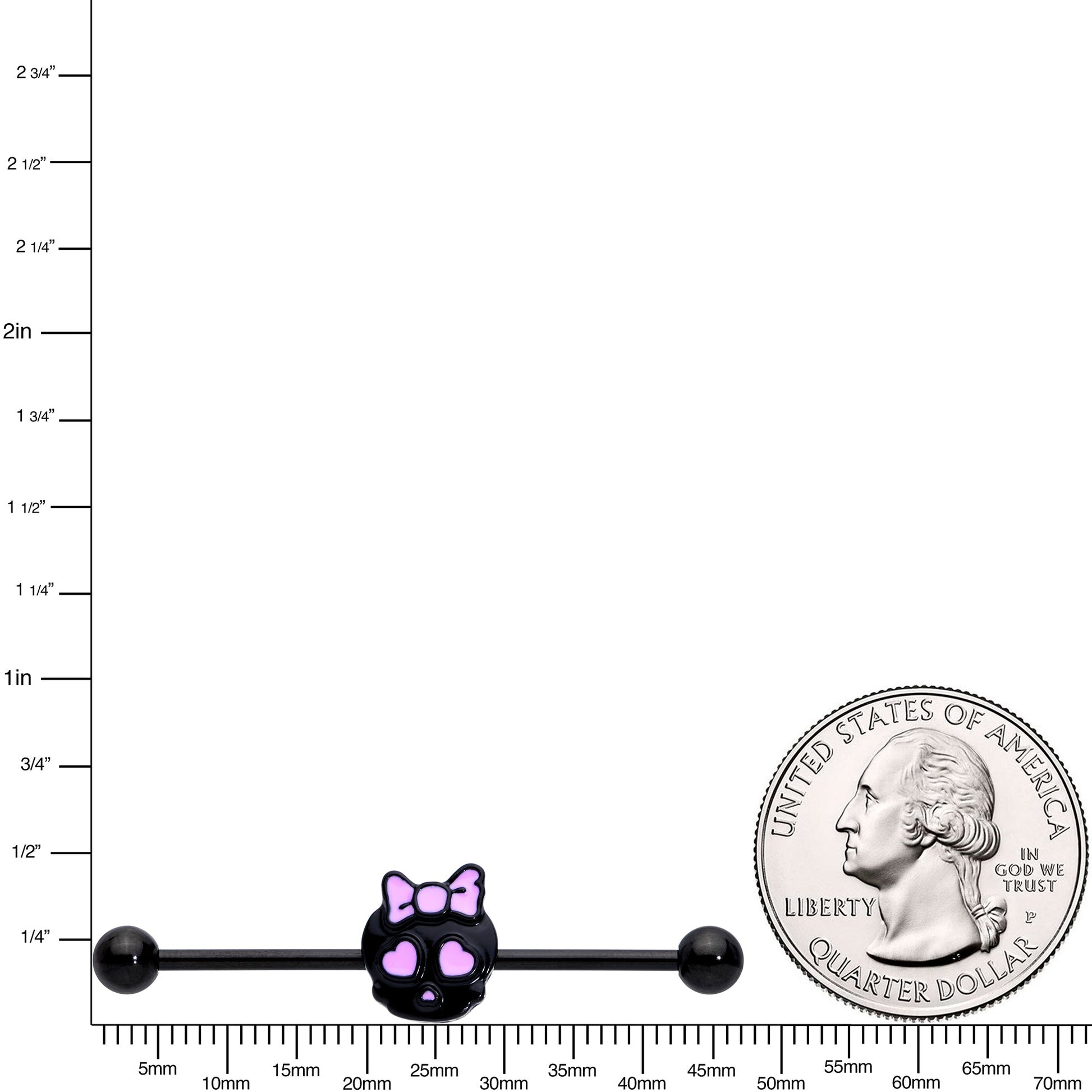 The skull on this 14 gauge helix barbell is a total sweetie! It's made with a 1 1/2" black plated over 316L surgical grade stainless steel straight barbell with black 5mm ball ends. It features a black skull charm. The skull has a pink bow embellishment on its head and matching pink heart-shaped eyes for a look that transforms it from creepy to cute. You can even slide the charm up and down the length of the barbell for the perfect look. Take your industrial piercing from "alarming" to "adorable" with this cute and captivating skull barbell earring!Specifications