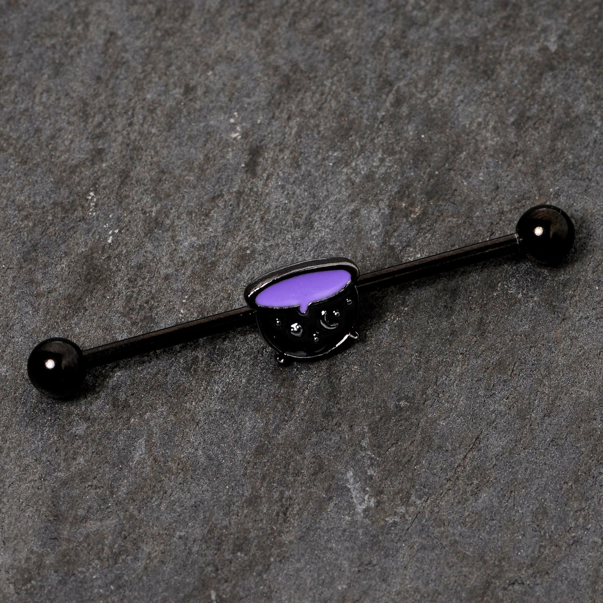 Brew up something magical in your industrial piercing with this 14 gauge helix barbell! It's made with a 1 1/2" black PVD over 316L surgical grade stainless steel straight barbell with 5mm ball ends. It features a charm of a black and purple witch's cauldron charm. Best of all, you can slide the charm up and down the length of the barbell industrial so you get just the look you want. This industrial earring is sure to get your look cooking!Specifications
