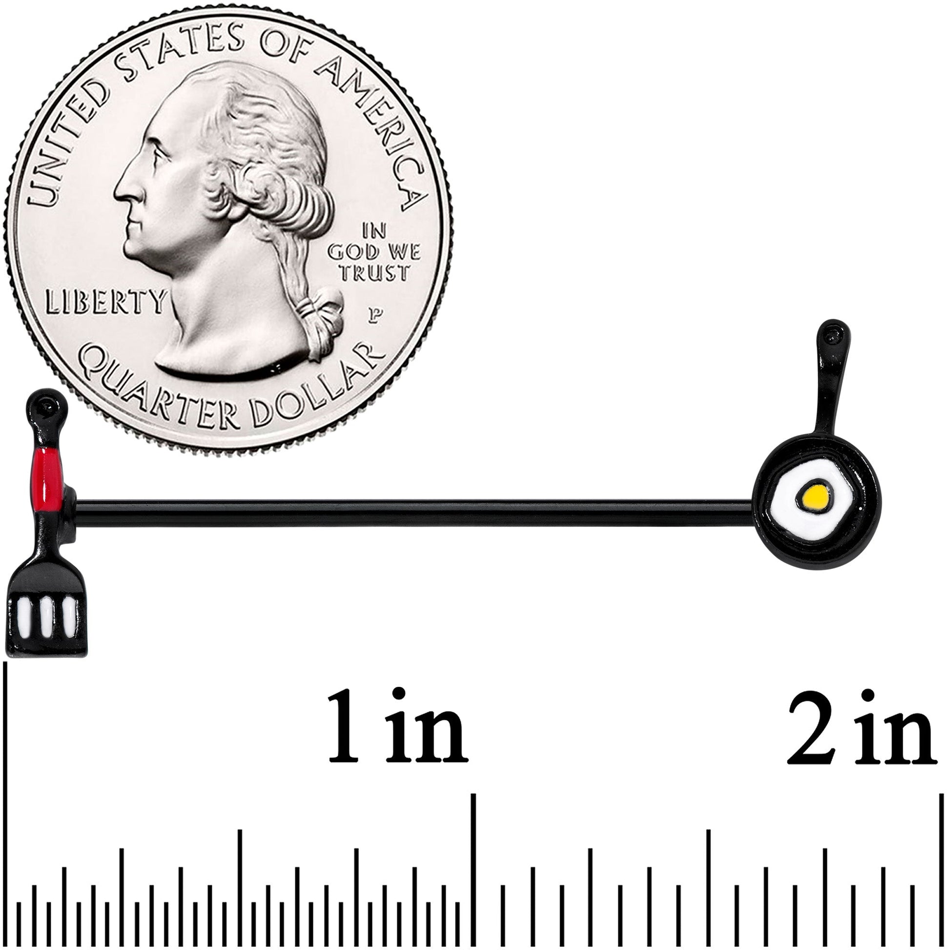 Now the cook can be hotter than the kitchen in this 14 gauge helix barbell! It's made with a 1 1/2" black PVD over 316L surgical grade stainless steel straight barbell. Each of the ends features a different cooking-themed charm. One side is a spatula charm, with open work detailing for a touch of realism. The other side features a frying pan charm, complete with an egg frying inside! It's a whole new recipe for looking delicious when you're rocking this chef-themed barbell earring!Specifications