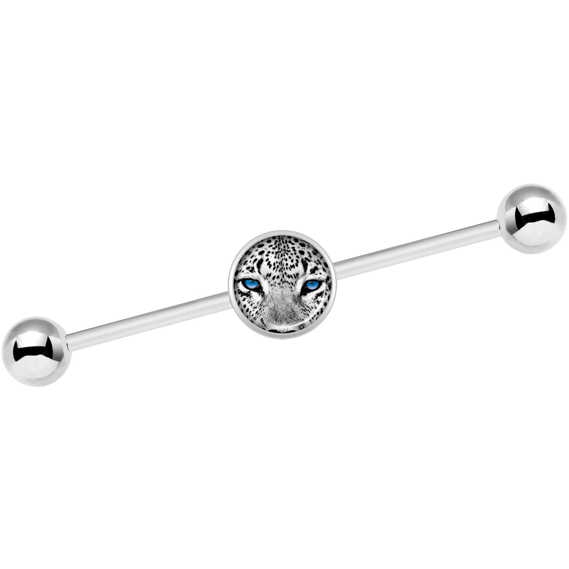 If you love cats of all sizes but especially black and white leopards then this 14 gauge industrial earring is right for you! Made with a 1.45" durable 316L surgical grade stainless steel straight barbell, this straight barbell jewelry features a nonmoving logo inlay charm and 6mm ball ends.