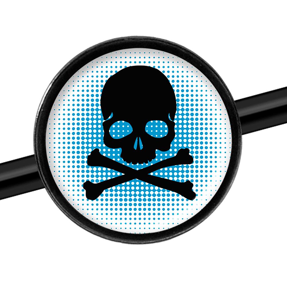 If you love the color blue and scary Halloween skull and crossbones then this 14 gauge industrial earring is right for you! Made with a 1.45" black anodized over 316L surgical grade stainless steel straight barbell, this straight barbell jewelry features a nonmoving logo inlay charm and 6mm ball ends.