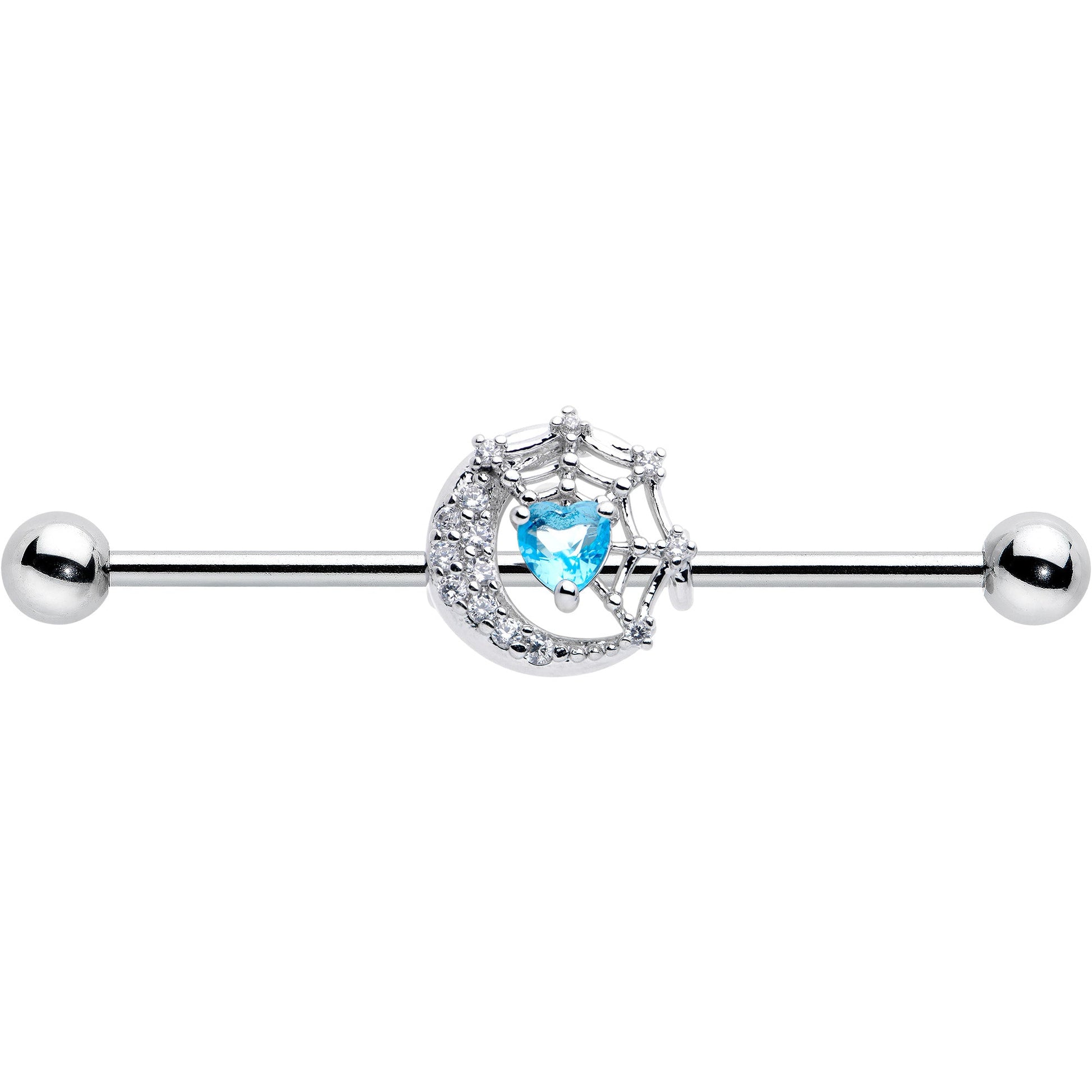 14G Blue CZ Gem Heart Web Moon Industrial Barbell 38mm