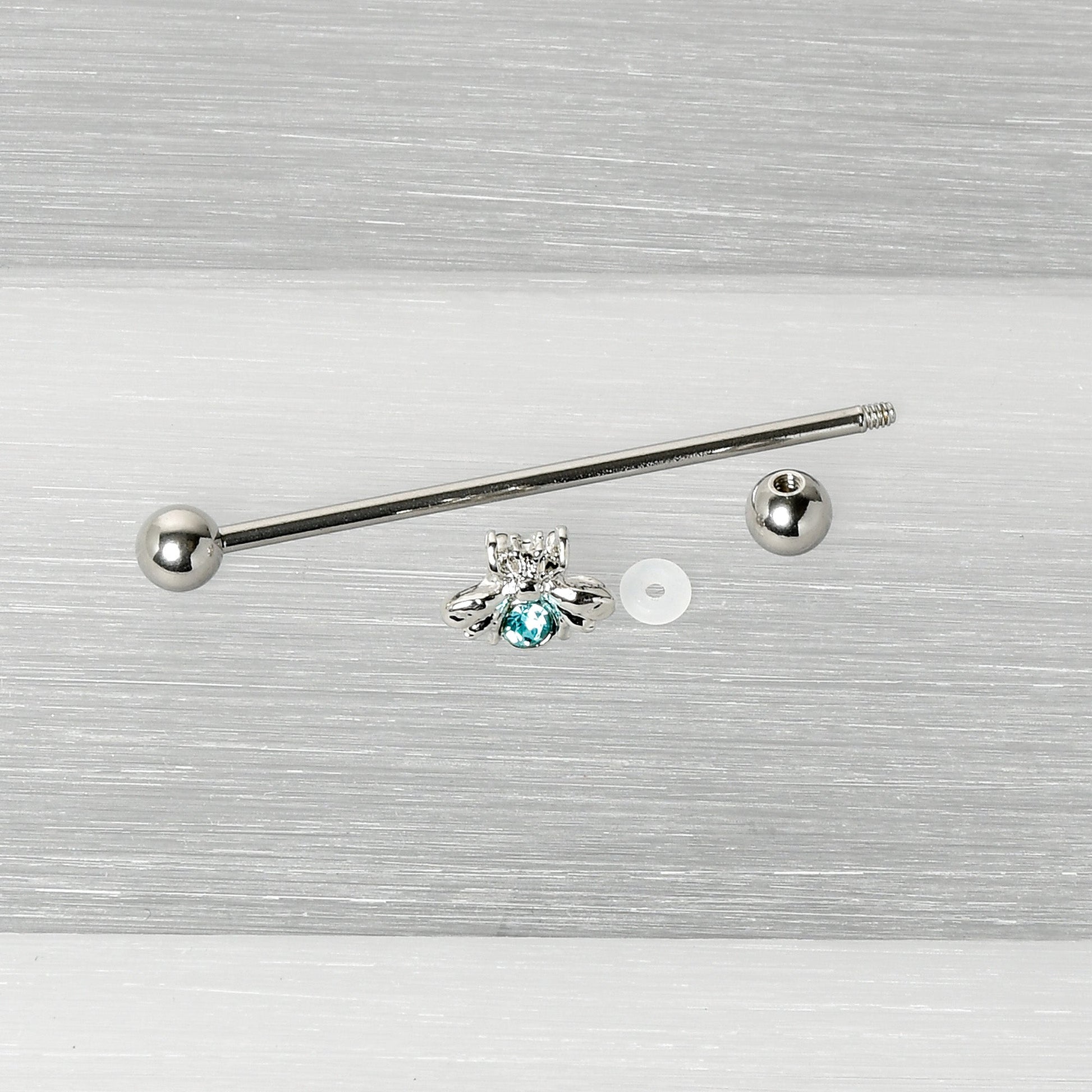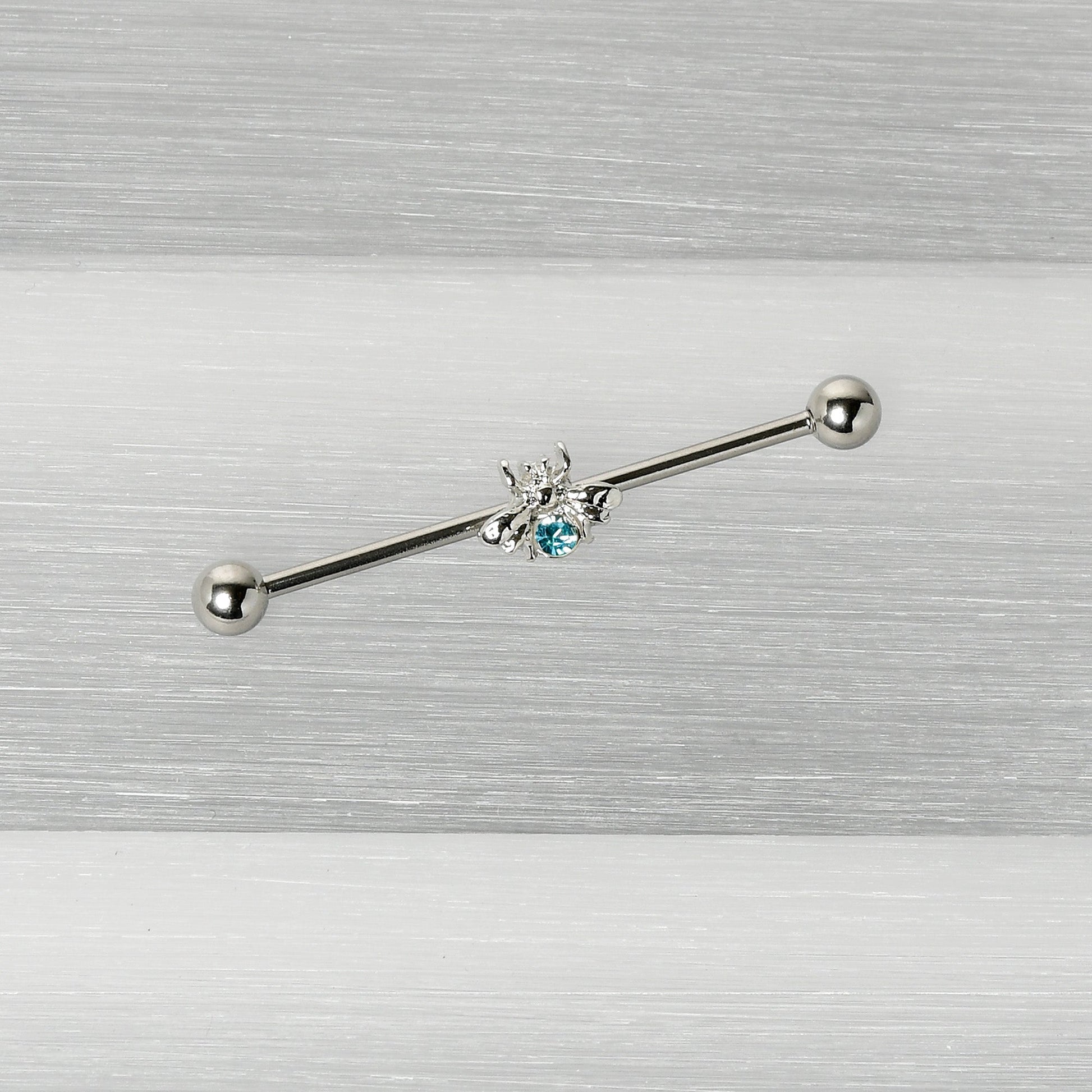 This 14 gauge helix barbell is sure to give you one honey of a new look! It's made with a 1 1/2" durable 316L surgical grade stainless steel straight barbell with 5mm ball ends. It features a bee charm, with the body composed of a single large blue gem. It also features stylized wings and legs for a realistic and airy appearance and you can slide it up and down the barbell for the perfect look. This unconventional insect jewelry is sure going to make your industrial piercing look super sweet!Specifications