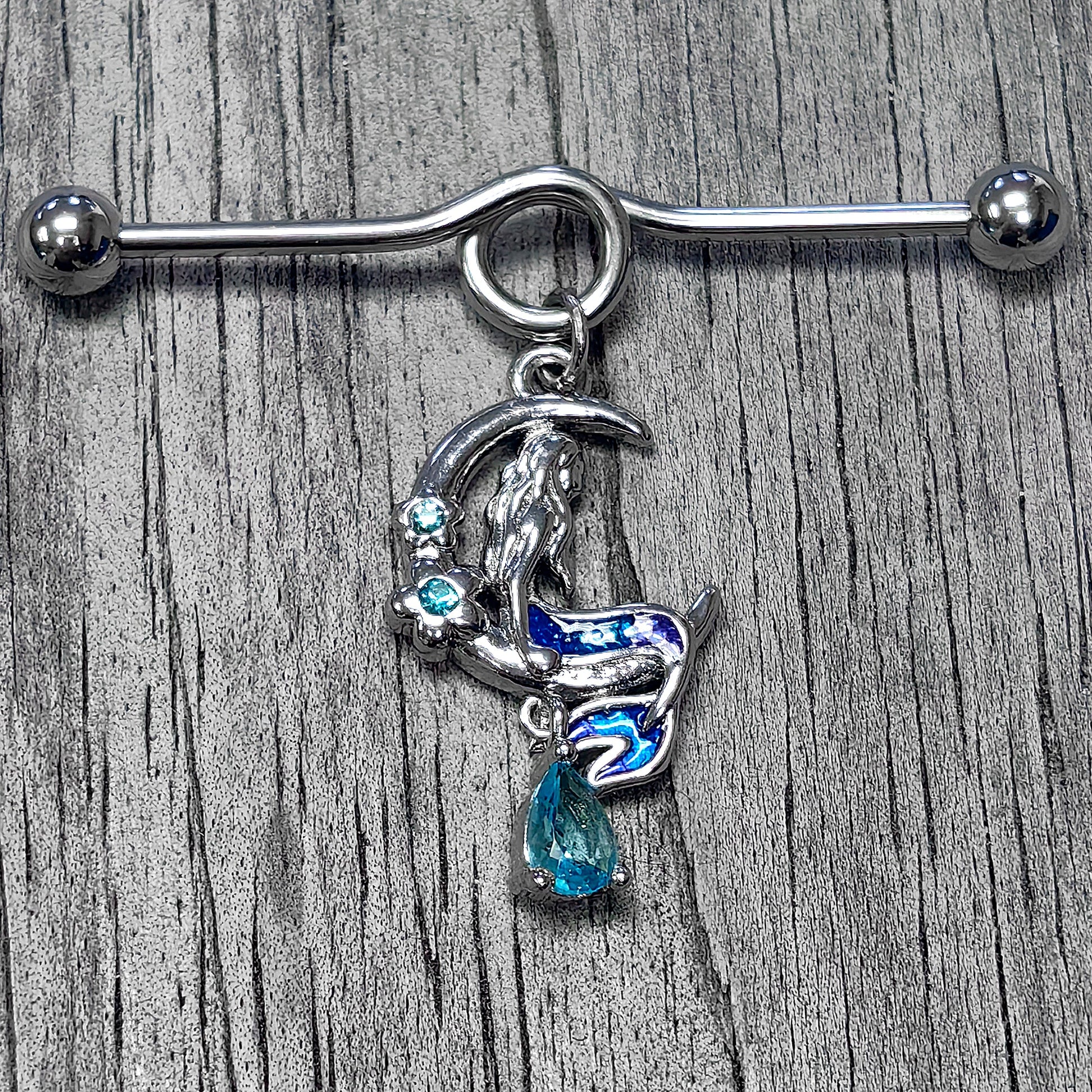 14G Blue Gem Floral Mermaid Moon Dangle Project Bar 38mm