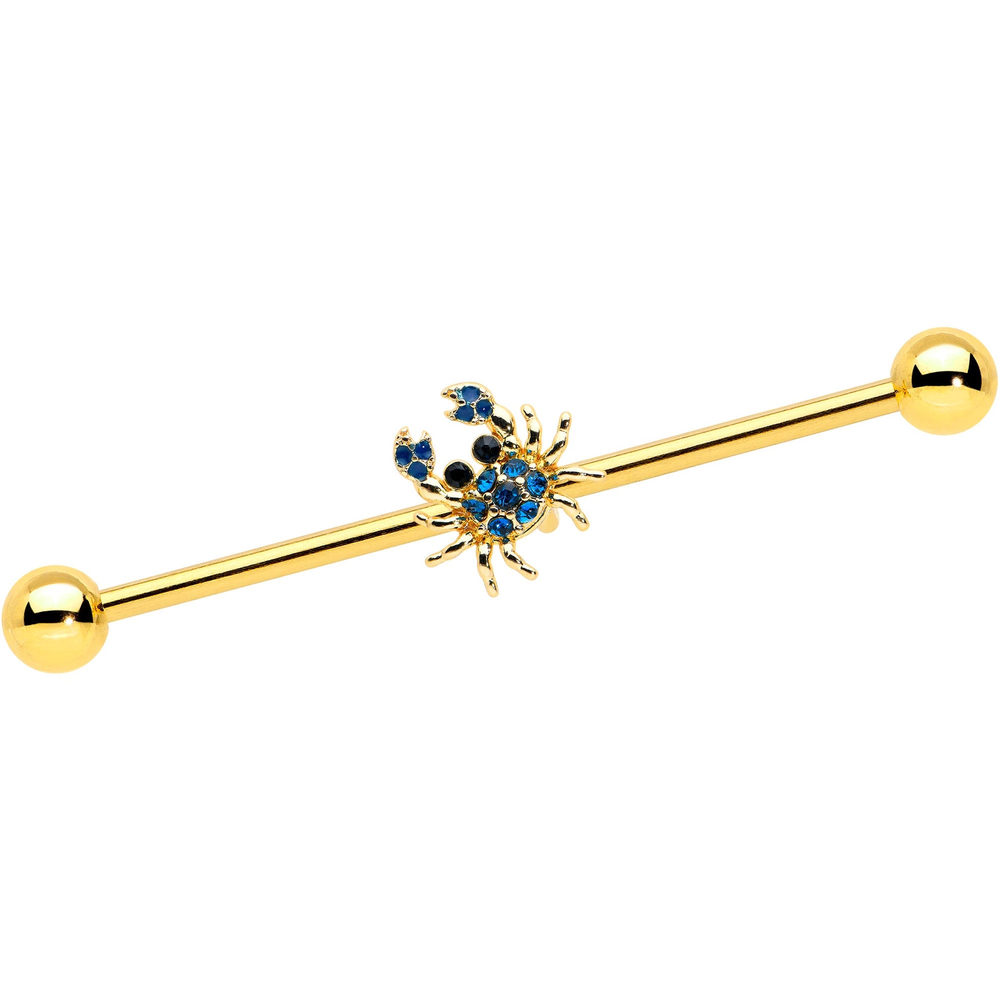 Catch a case of style when you're rocking this 14 gauge helix barbell! It's made with a 1 1/2" gold tone PVD over 316L surgical grade stainless steel straight barbell with 5mm ball ends. It features a crab charm, set with blue gems and black gem eyes. This colorful crustacean is further embellished with textured detailing for a look that's sure to please. You can even slide it up and down the length of the barbell for the perfect look! This colorful crabby charmer is a perfect summer look for your industrial piercing!Specifications