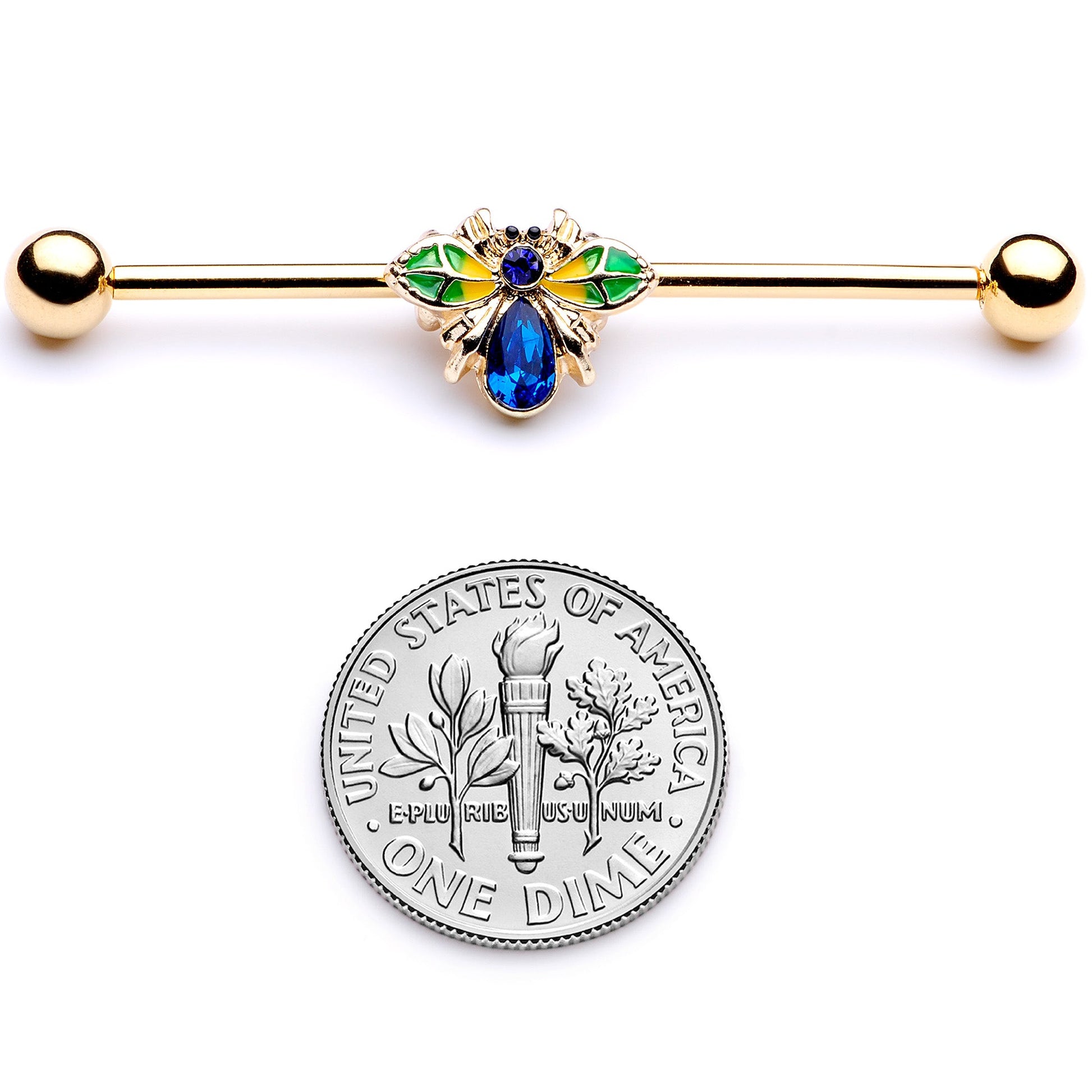 14 Gauge Blue Gem Gold Tone Colorful Bee Industrial Barbell 38mm