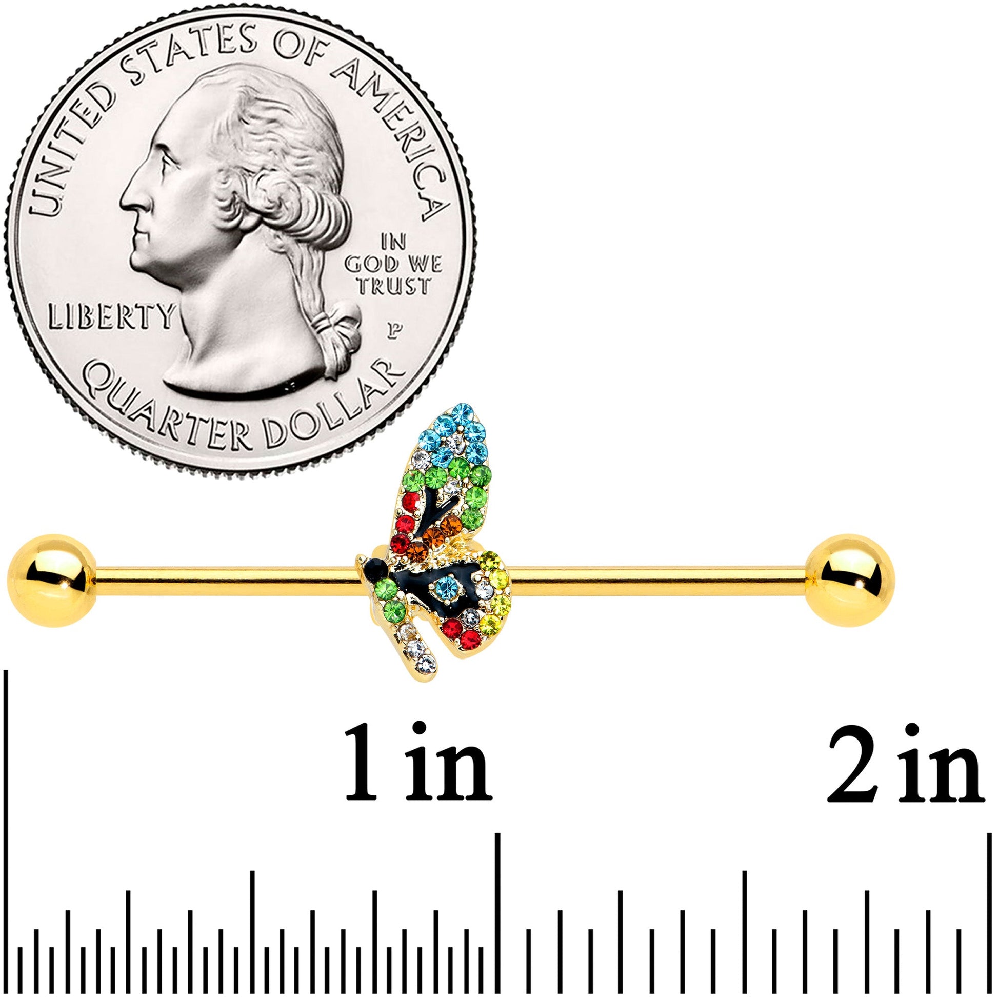 The bird on this 14 gauge helix barbell absolutely screams glamour! It's made with a 1 1/2" gold tone plated over 316L surgical grade stainless steel straight barbell with 5mm ball ends. It features a bird charm, wings spread wide as if in flight. The bird is set with a rainbow of different color gems, ranging from blue, red, green, and yellow for a look that is truly meant to get attention.And you can even slide it up and down the length of the barbell to get the ideal look! Give your look a whole new level of glitz and glamour with this colorful bird barbell earring!Specifications