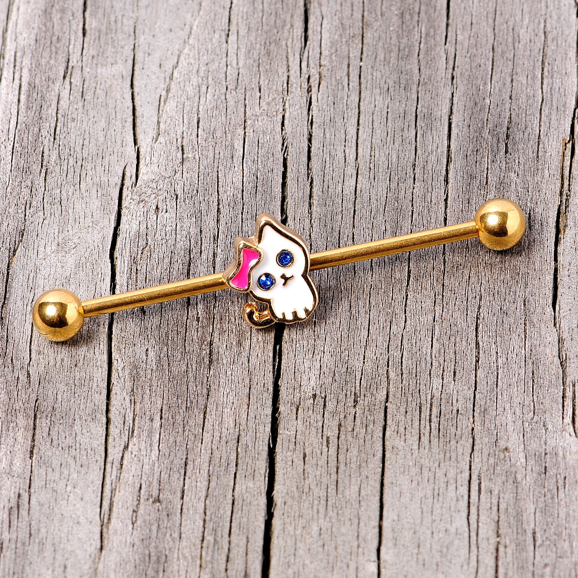 This 14 gauge pretty kitty is flaunting her big blue eyes in hopes that someone will give her a fur-ever home! This helix barbell is made with a 1 1/2" gold tone PVD over 316L surgical grade stainless steel straight barbell with 5mm ball ends. It features a white kitty cat charm with blue gem eyes and a pretty pink bow. And you can slide her up and down the length of the barbell industrial so you get just the look you're after. So go ahead and take this cat barbell earring home - she's sure to look purrfect in your helix piercing!Specifications