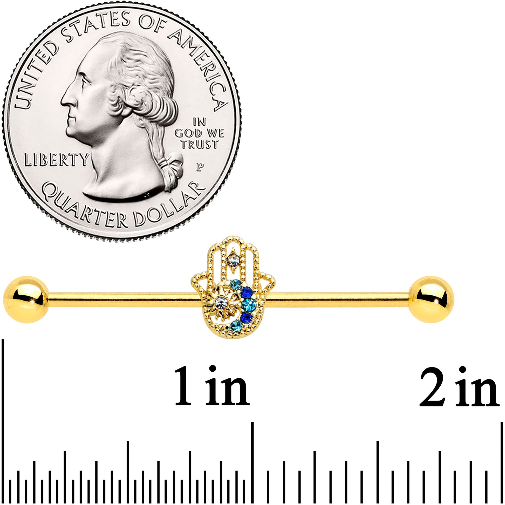 14 Gauge Blue Gem Gold Tone Texture Hamsa Hand Industrial Barbell 38mm