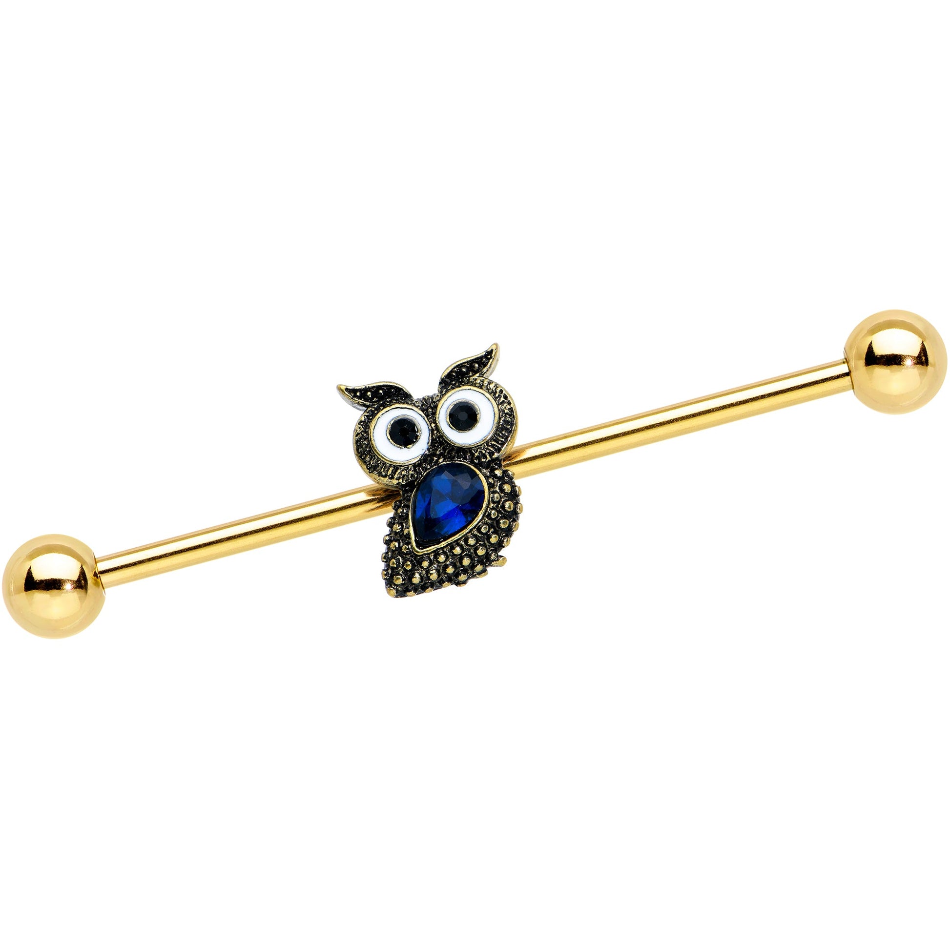 14 Gauge Blue Gem Gold Tone Wide Eyed Owl Industrial Barbell 38mm