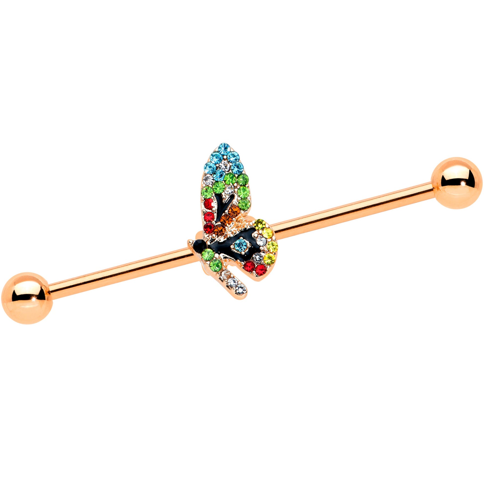 The bird on this 14 gauge helix barbell absolutely screams glamour! It's made with a 1 1/2" rose gold tone plated over 316L surgical grade stainless steel straight barbell with 5mm ball ends. It features a bird charm, wings spread wide as if in flight. The bird is set with a rainbow of different color gems, ranging from blue, red, green, and yellow for a look that is truly meant to get attention.And you can even slide it up and down the length of the barbell to get the ideal look! Give your look a whole new level of glitz and glamour with this colorful bird barbell earring!Specifications