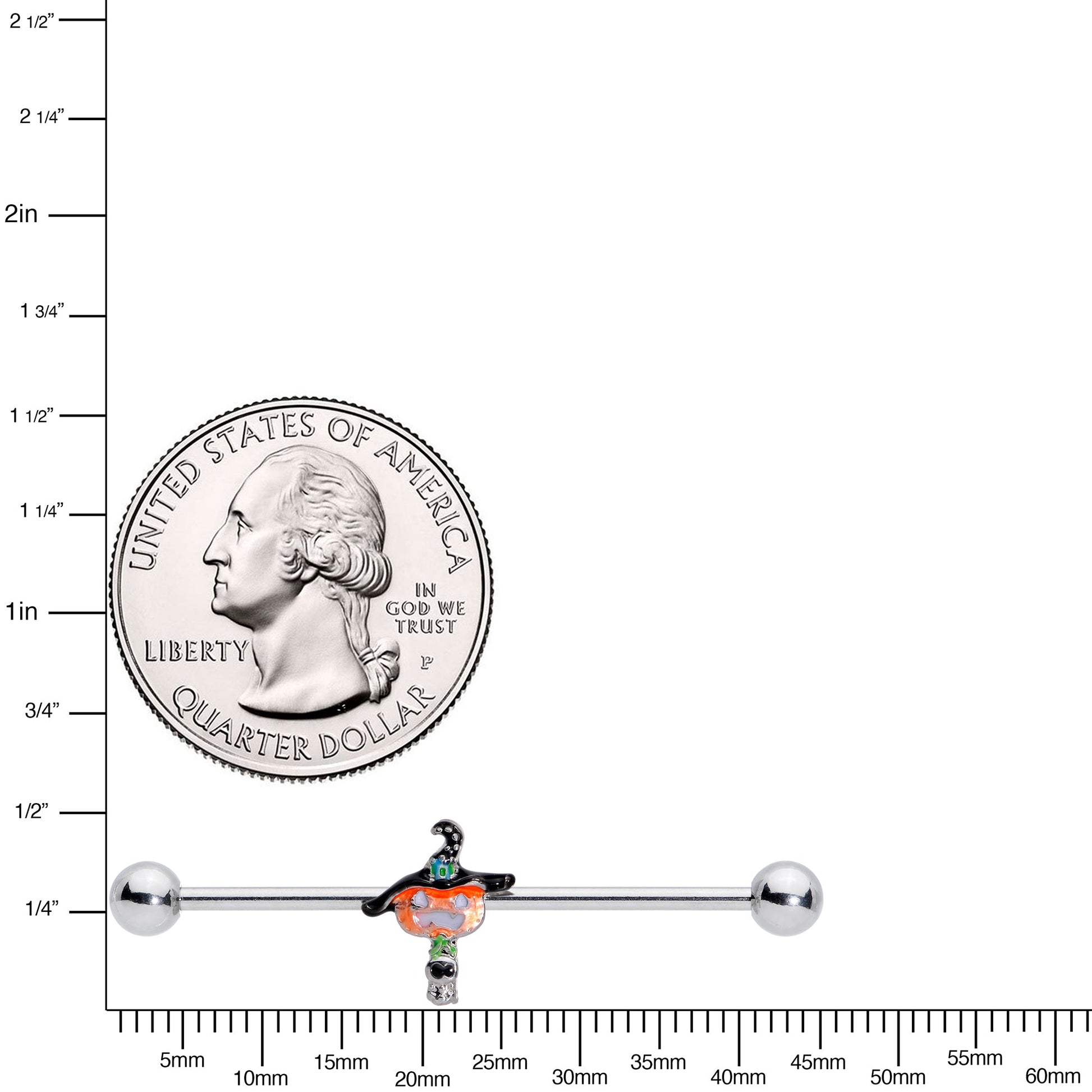 The Halloween pumpkin on this 14 gauge helix barbell is liable to cast a spell on you! It's made with a 1 1/2" durable 316L surgical grade stainless steel straight barbell with 5mm ball ends. It features a charm of a jack o'lantern, inlaid in orange with white features. It's wearing a black witch's hat, set with a small blue gem, and is embellished on the bottom with color detailing and a small clear gem. You can even slide it up and down the length of the barbell to get the perfect look! This barbell earring is magic!Specifications