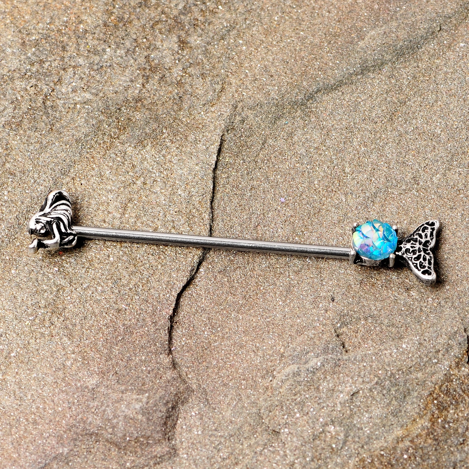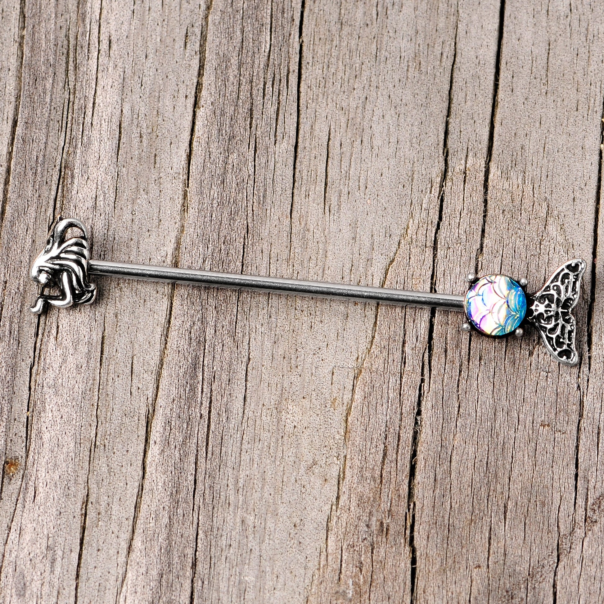 This adventurous mermaid has decided to see the world from your ear with this 14 gauge helix barbell! It's made with a 1 1/2" durable 316L surgical grade stainless steel straight barbell. One end features a mermaid's head charm and the other end features a tail charm with a blue mermaid scale orb that shifts color depending on the angle it's viewed from. At the very end is the mermaid's tail. Let this mermaid ride in your ear and she'll be sure to give your industrial piercing a lift!Specifications