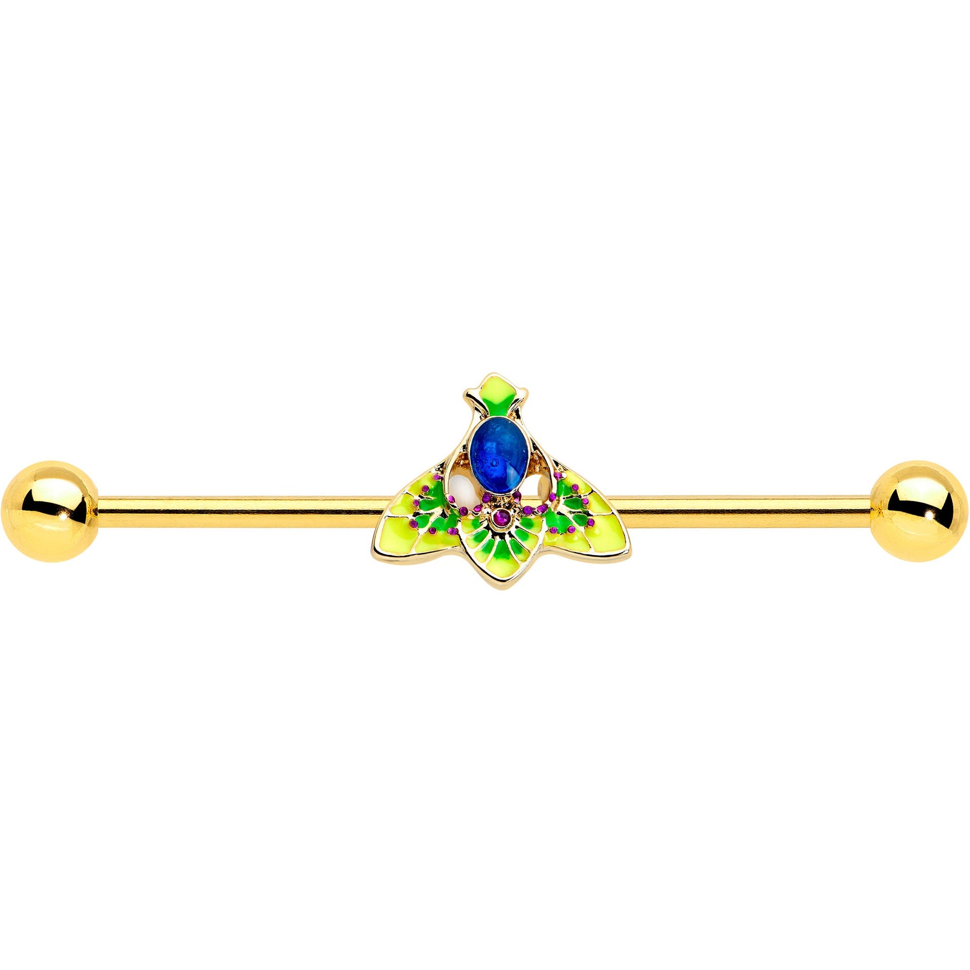 14 Gauge Blue Purple Gem Gold Tone Tropic Fan Industrial Barbell 38mm