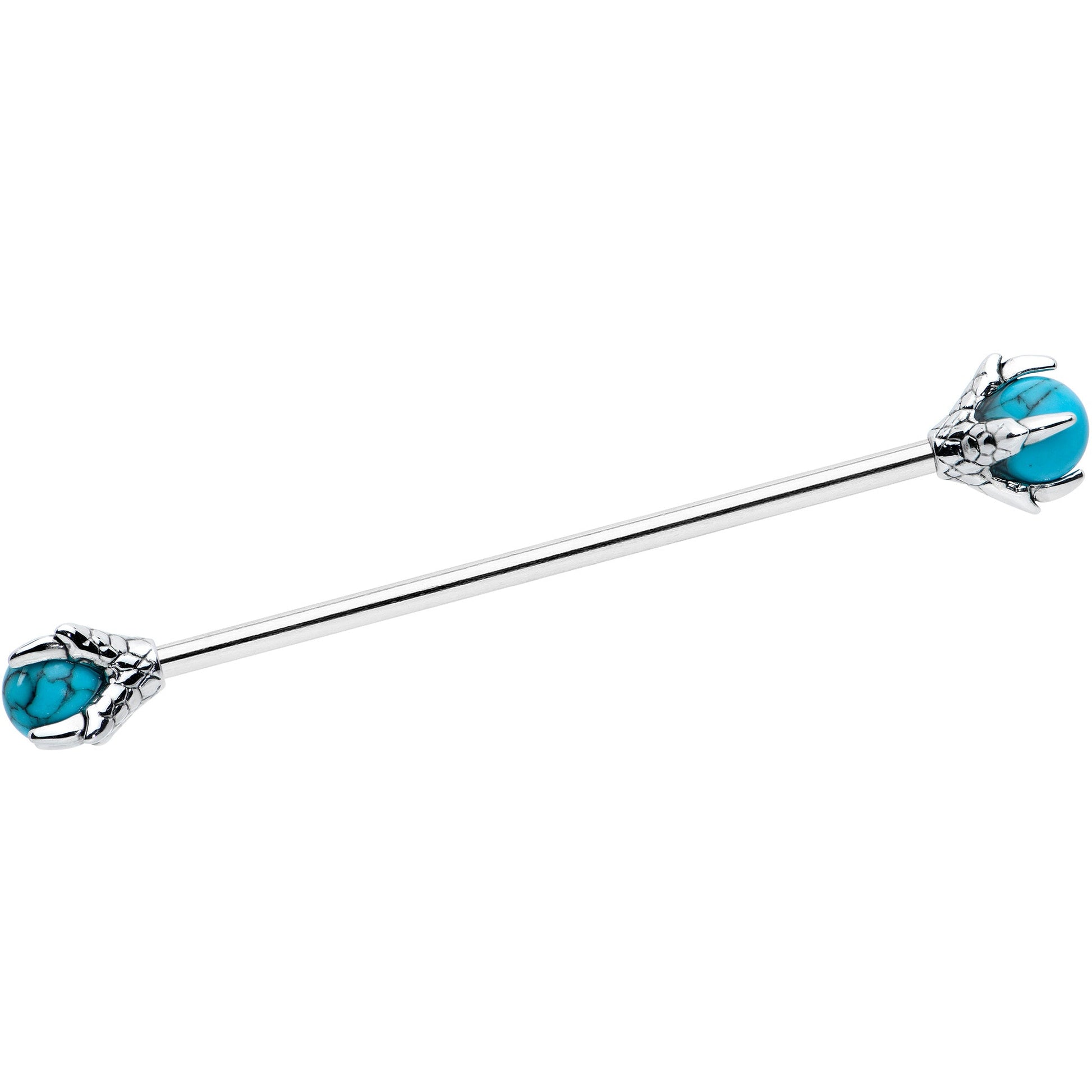 Add some creepy color to your look with this 14 gauge helix barbell! It's made with a 1 1/2" durable 316L surgical grade stainless steel straight barbell. Each of the ends features a matching clawed hand clutching a blue turquoise stone ball. You'll be having a ball as well with these creepy cool Halloween clawed hands in your industrial piercing!Specifications