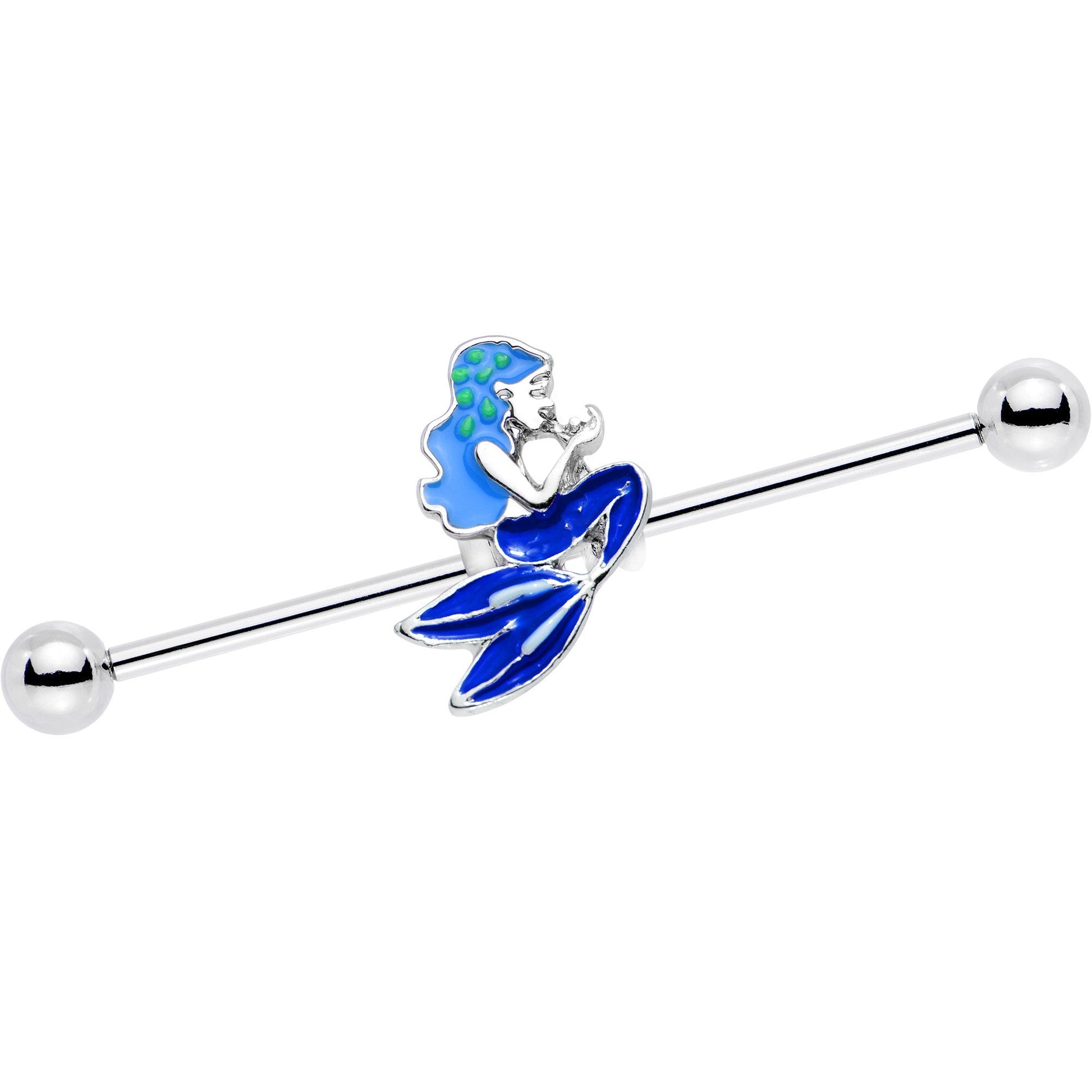 Show off your love of mythical undersea creatures when you wear this fun 14 gauge industrial earring. Made with a 38mm durable 316L surgical grade stainless steel straight barbell, this industrial piercing features a moveable blue and light blue detailed mermaid charm.