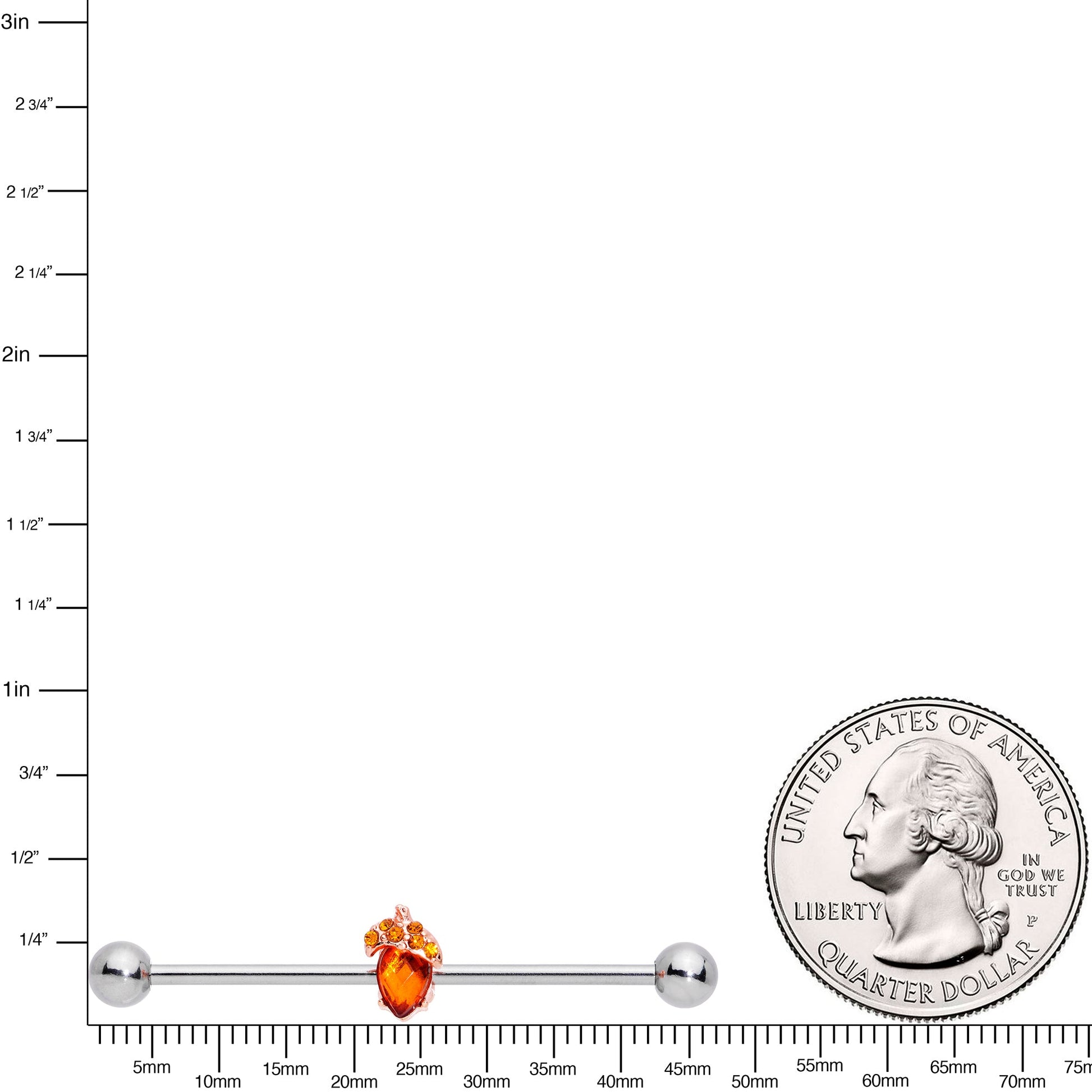 Let your look grow into something big with this 14 gauge helix barbell! It's made with a 1 1/2" durable 316L surgical grade stainless steel straight barbell with 5mm ball ends. It features an acorn charm with the body composed of a single brown gem. The acorn's cap is set with more brown gems for a cohesive and realistic style. And you can slide the charm up and down the length of the barbell to get just the look you want. Let nature's own beauty lend some agrarian appeal to your industrial piercing with this arboreal acorn barbell earring!Specifications