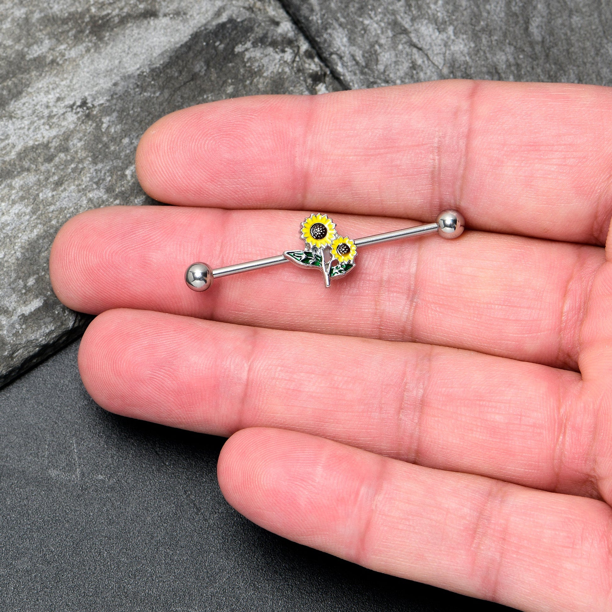 The sun is out and ready to make you smile with this 14 gauge helix barbell. It is made with a 1 1/2 inch 316L surgical grade stainless steel straight barbell with 5mm ball ends. It features a yellow double sunflower charm with textured detailing at their edges. They are further embellished with a yellow and brown inlay and green inlaid leaves. You can even slide them up and down the length of the barbell for the perfect look. Make every day a sunny day with this striking sunflower barbell earring.Specifications