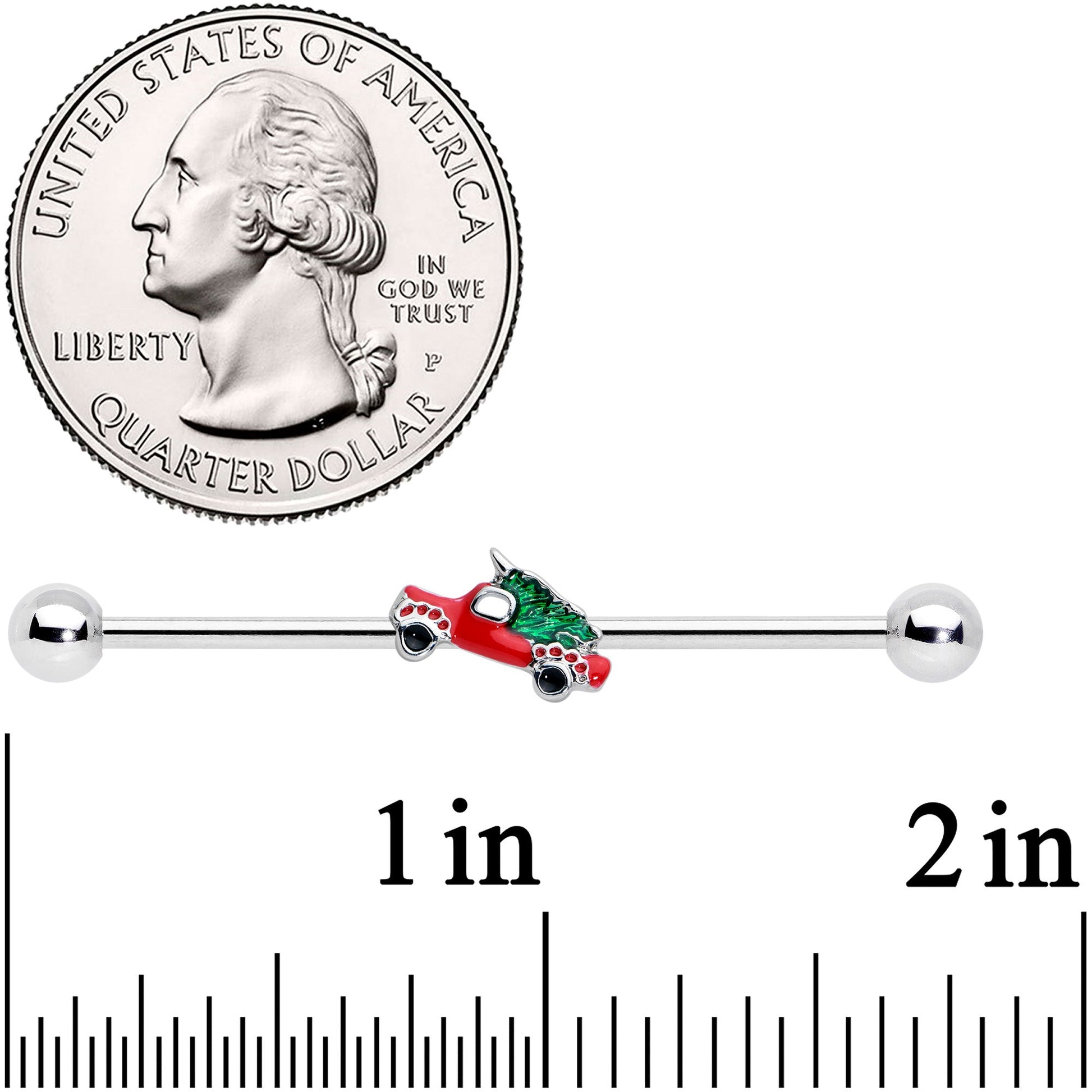 Bring home the boughs and start decorating with this 14 gauge helix barbell! It's made with a 1 1/2" durable 316L surgical grade stainless steel straight barbell with 5mm ball ends. It features a truck charm, inlaid in red with black wheels. In the back of the truck is a festive green Christmas tree, on its way to get decorated for the season. You can even slide the charm up and down the length of the barbell to get the look you're wishing for! Rock a tree in a truck without having to fight traffic with this Christmas-themed barbell earring!Specifications