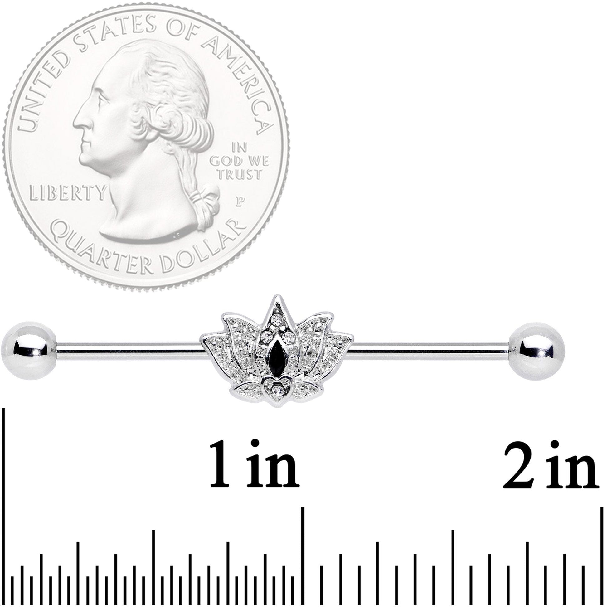 14G Clear Black Gem Crown Lotus Flower Industrial Barbell 38mm