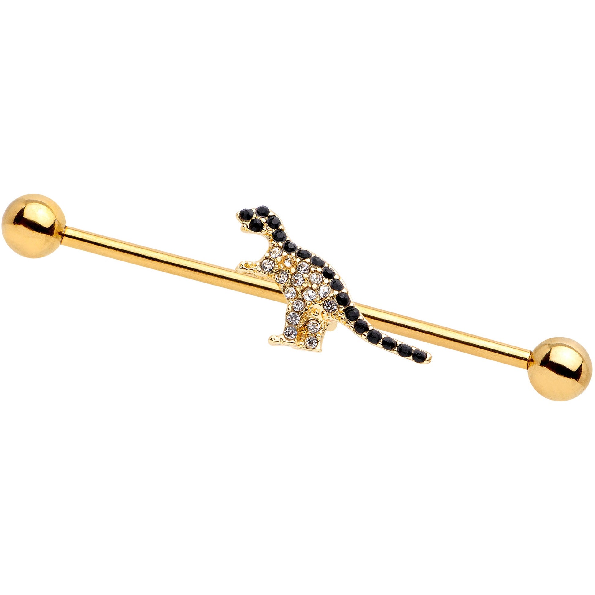 This 14 gauge helix barbell is so full of luxe glamour that it's almost....decadent! It's made with a 1 1/2" gold tone PVD over 316L surgical grade stainless steel straight barbell with 5mm ball ends. It features a large charm of a ferocious T. Rex charm with clear gems. This deluxe dinosaur charm also features black gems for maximum visual impact. And this dinosaur can be slid up and down the length of the barbell to get you just the look you're after! This industrial bar is sure to make you roar - with delight!Specifications
