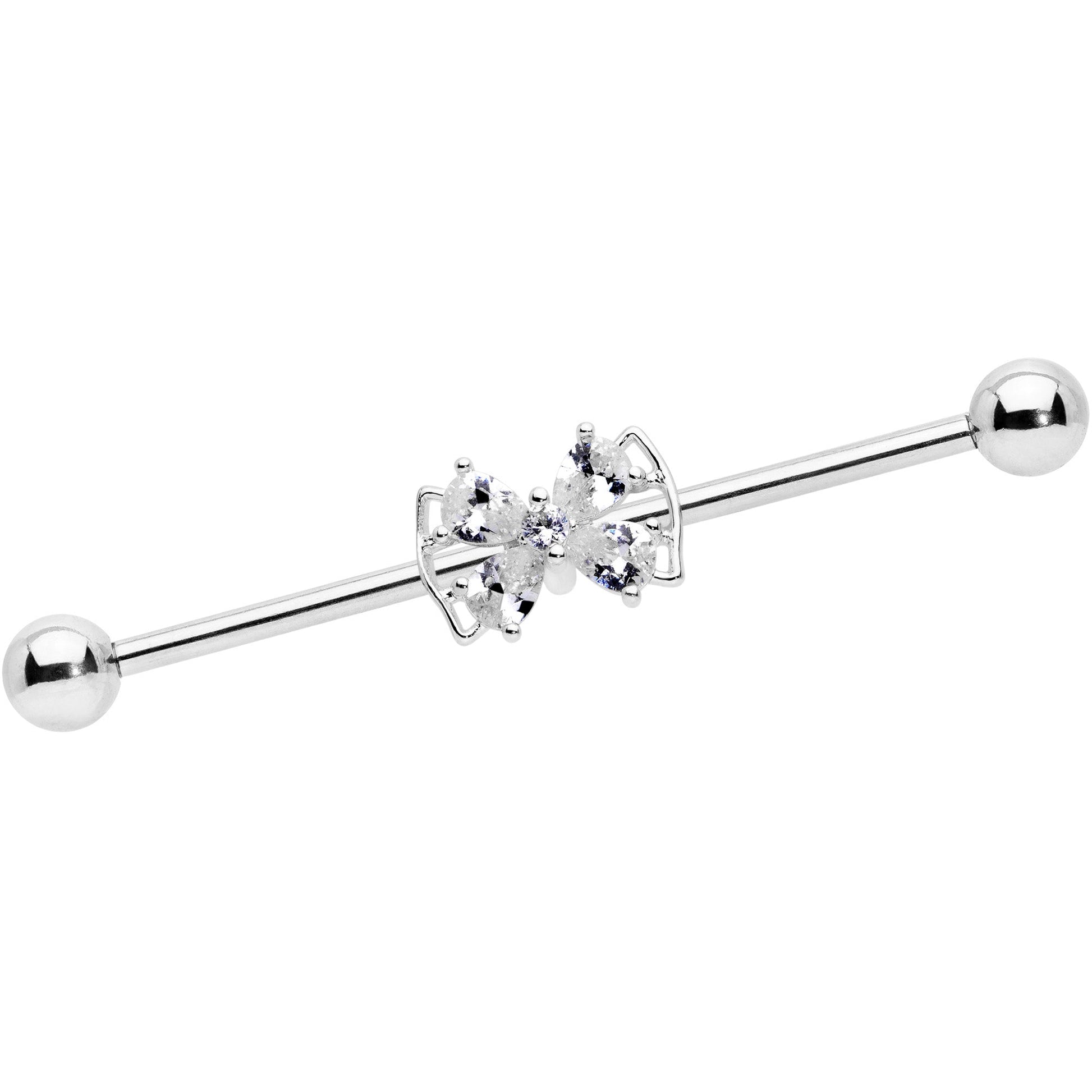 Bows on barbells make them extra beautiful, like on this 14 gauge helix barbell! It's made with a 1 1/2" durable 316L surgical grade stainless steel straight barbell with 5mm ball ends. It features a bow-shaped charm, set with four clear cubic zirconia gems for an extra luxe appearance. You can even slide the charm up and down the length of the barbell to get the perfect look. Your industrial piercing will be bold and beautiful with this beauty bow barbell earring!Specifications