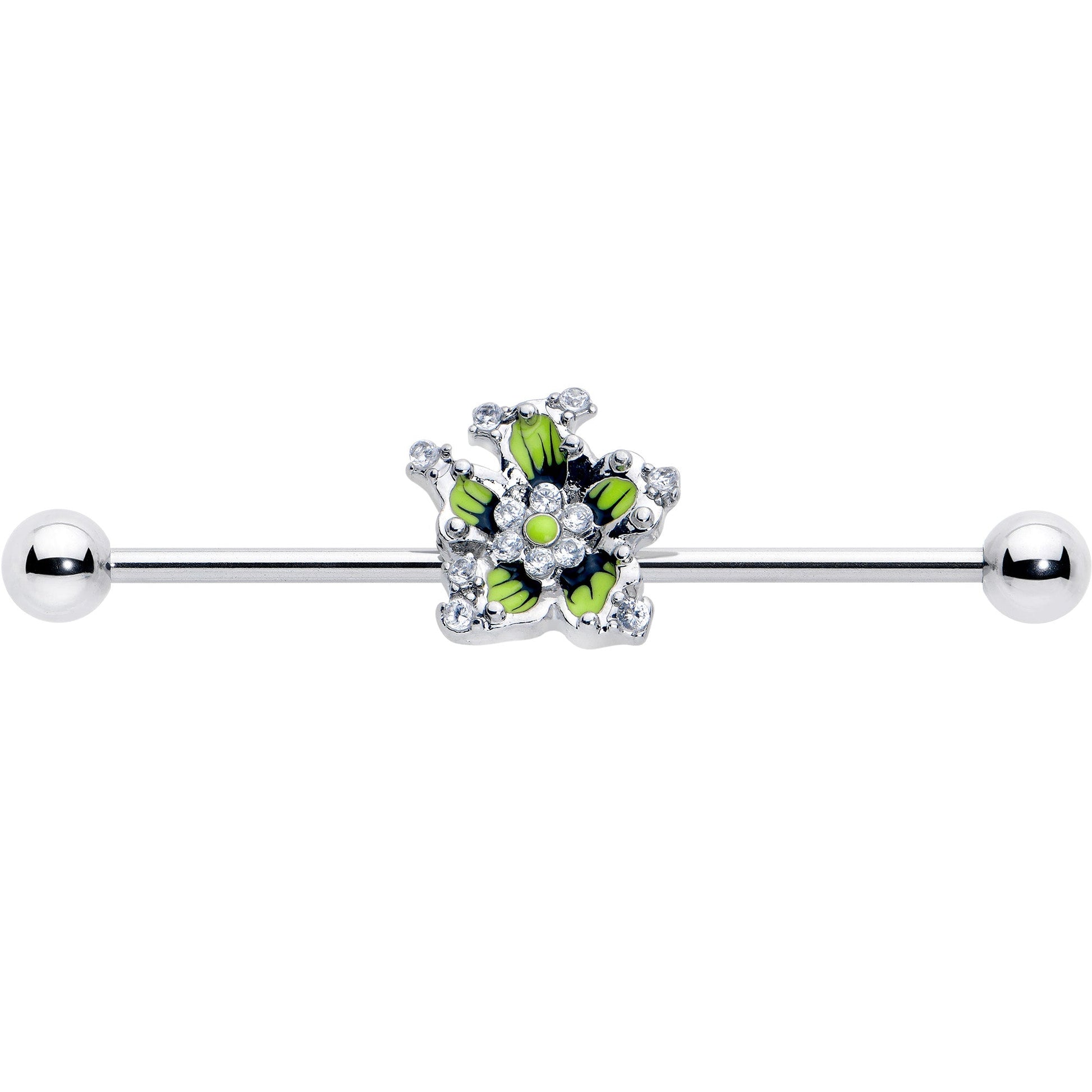 14 Gauge Clear CZ Gem Go Green Flower Industrial Barbell 38mm