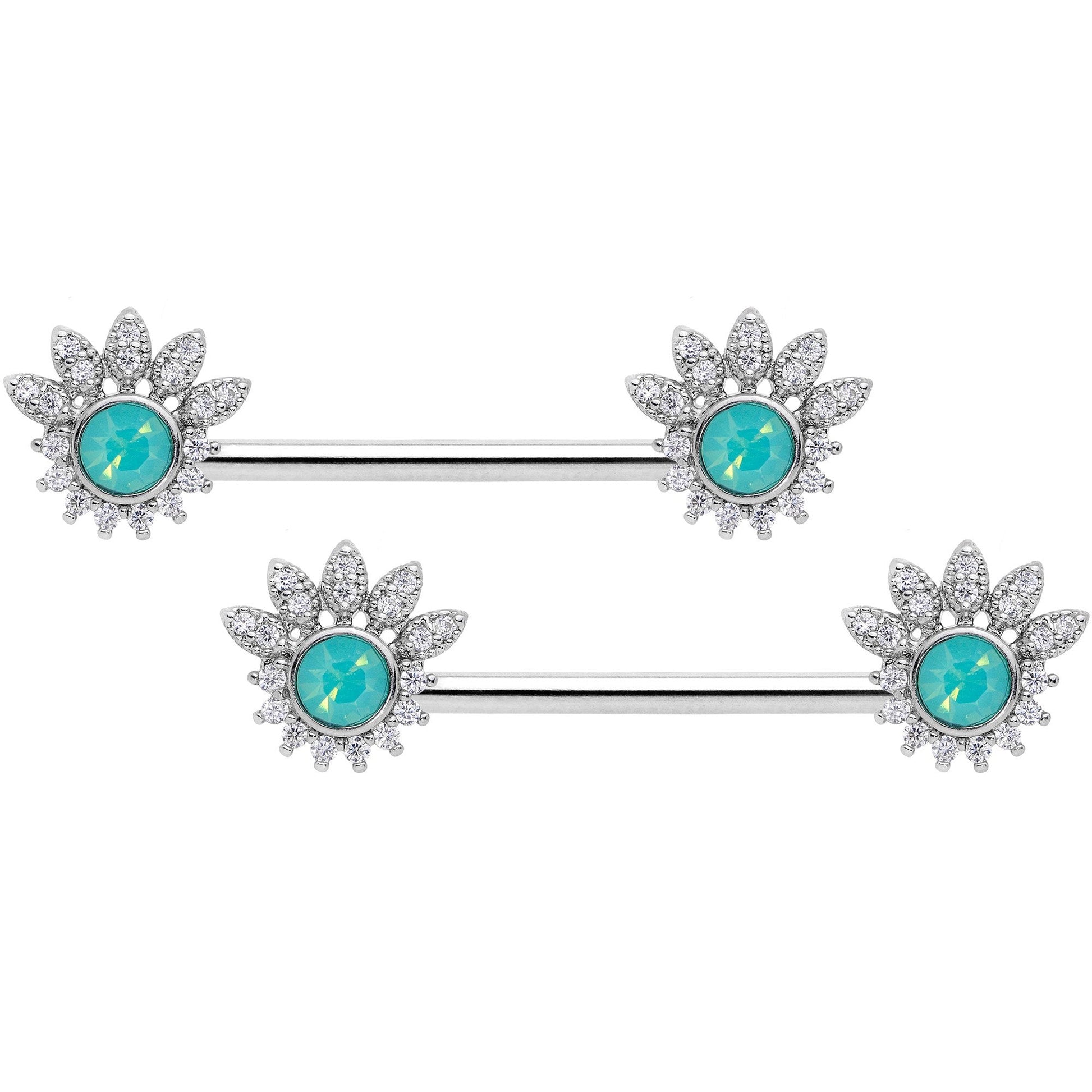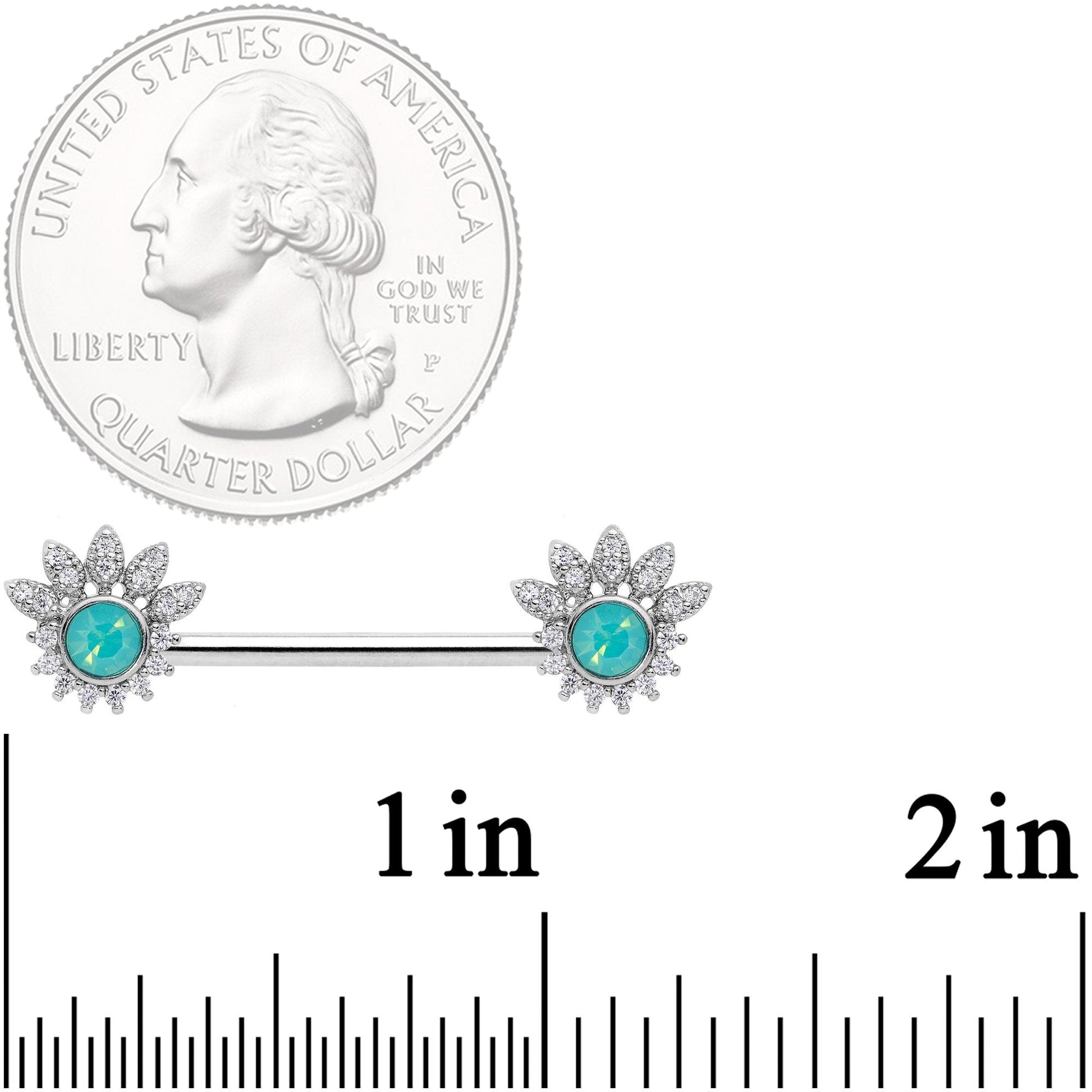 14G Clear CZ Gem Green Faux Opal Crest Barbell Nipple Ring Set