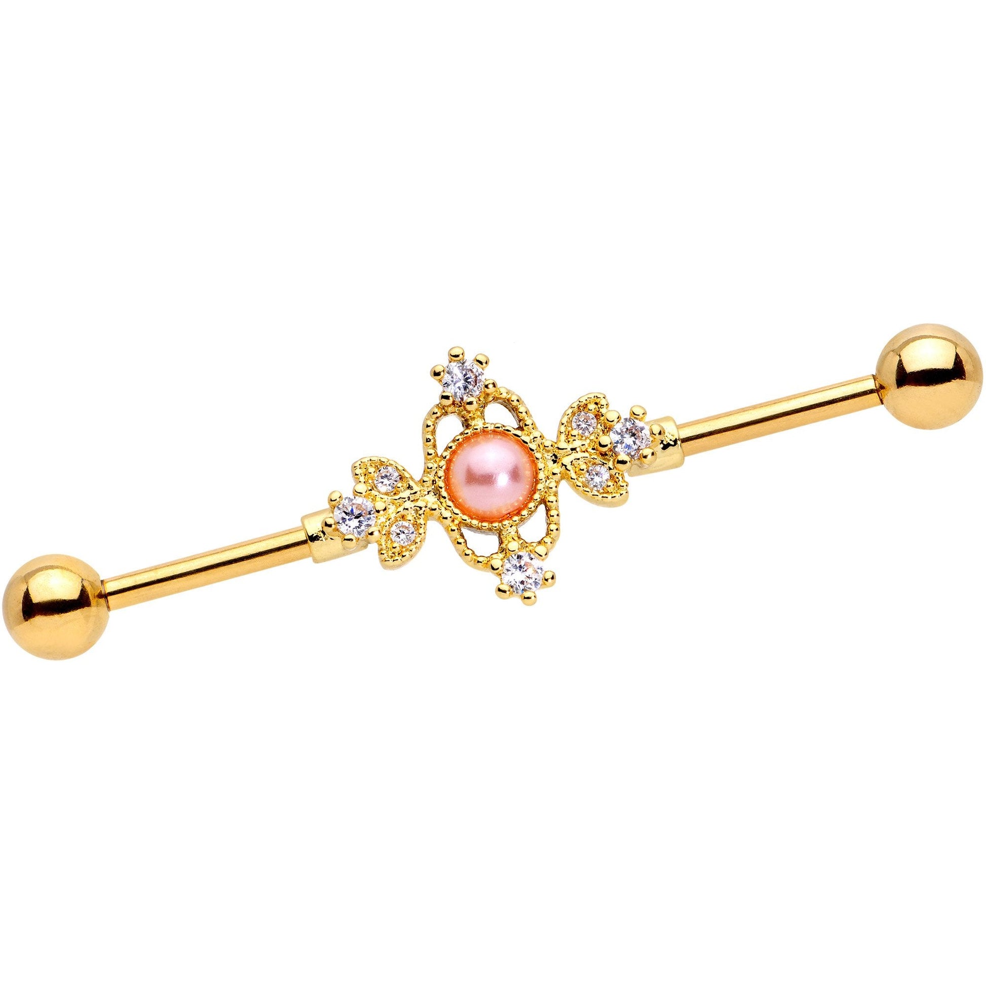 If you're looking for something regal that's ready to complete your look you will love this 14 gauge industrial piercing that is perfect for royalty. Made with a 1 1/2" gold tone PVD over 316L surgical grade stainless steel straight barbell, this industrial jewelry features a decadent nonmoving center formed with a central rosy pink orb surrounded by a regal setting and clear cubic zirconia gems.Specifications