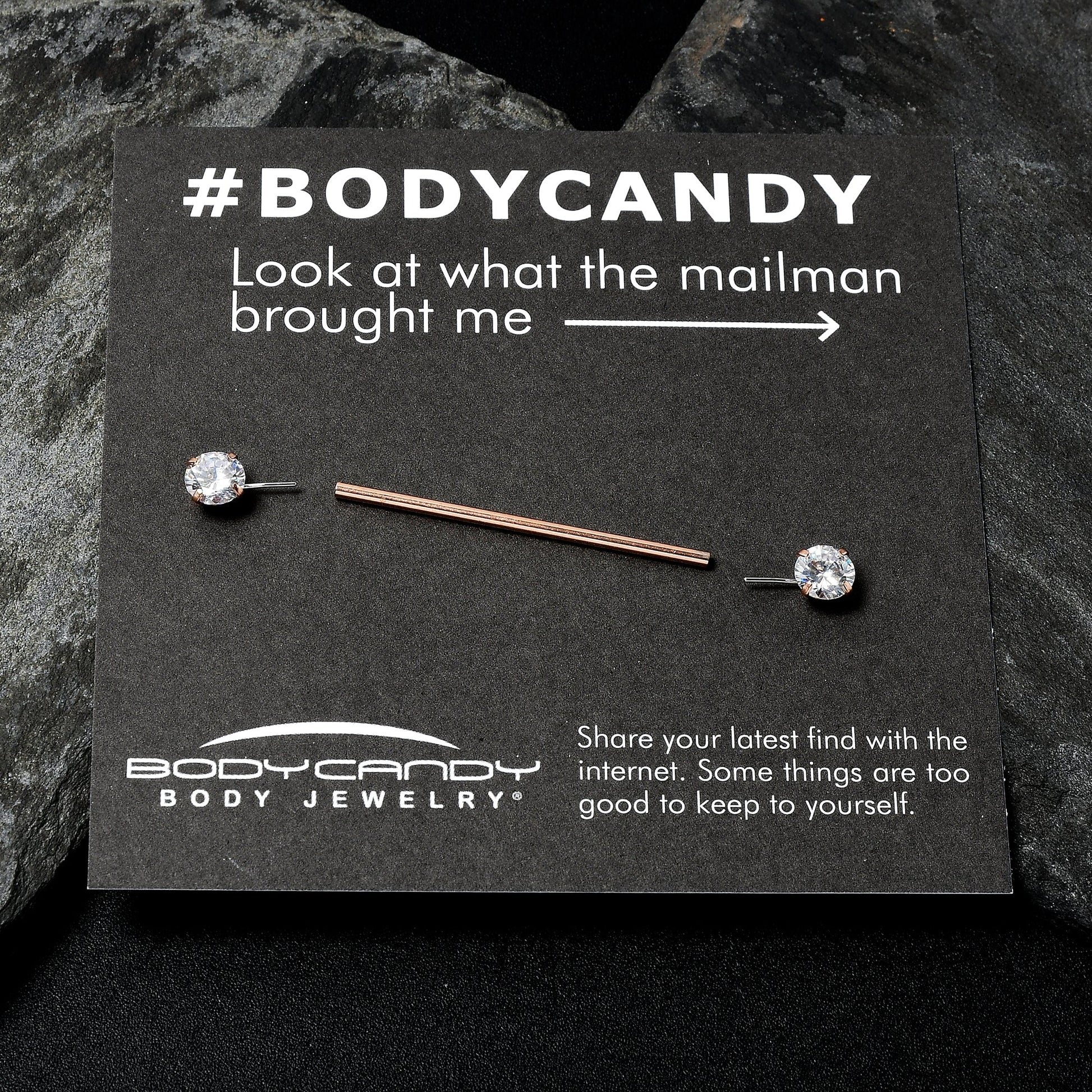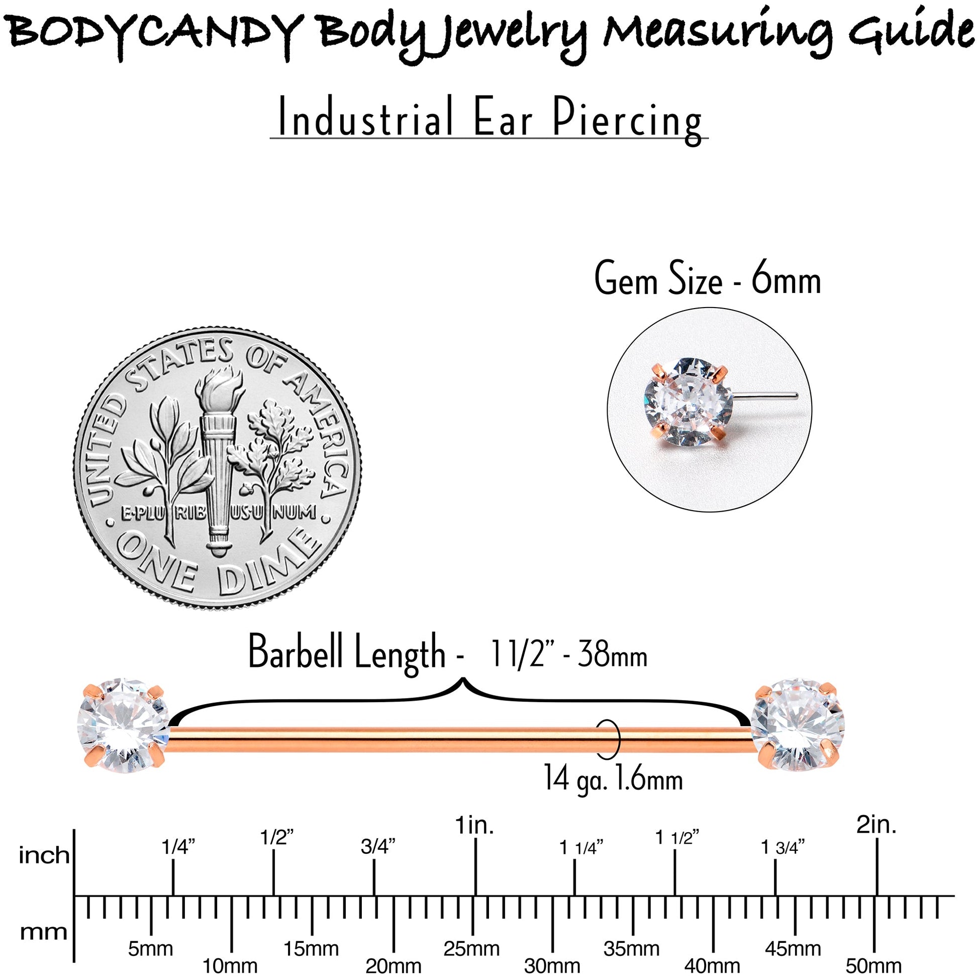 Add some sexy sophistication to your industrial piercing with this 14 gauge helix barbell! It's made with a 1 1/2" rose gold PVD over 316L surgical grade stainless steel straight barbell. The charm ends are threadless round clear cubic zirconia gems made to make insertion and removal a breeze while still offering a secure fit. With their easy elegance and uncomplicated sophistication, this barbell earring really does have it all!Specifications