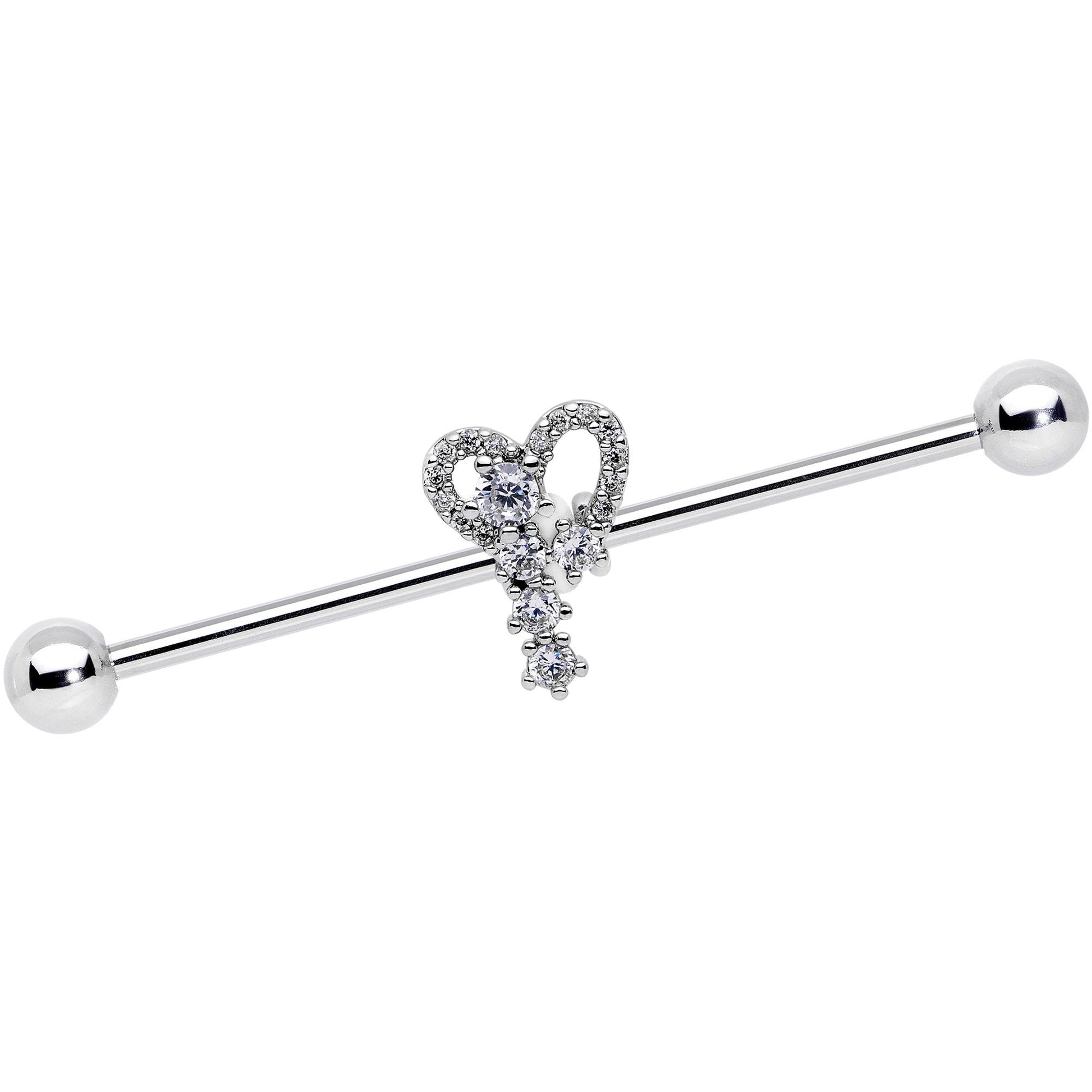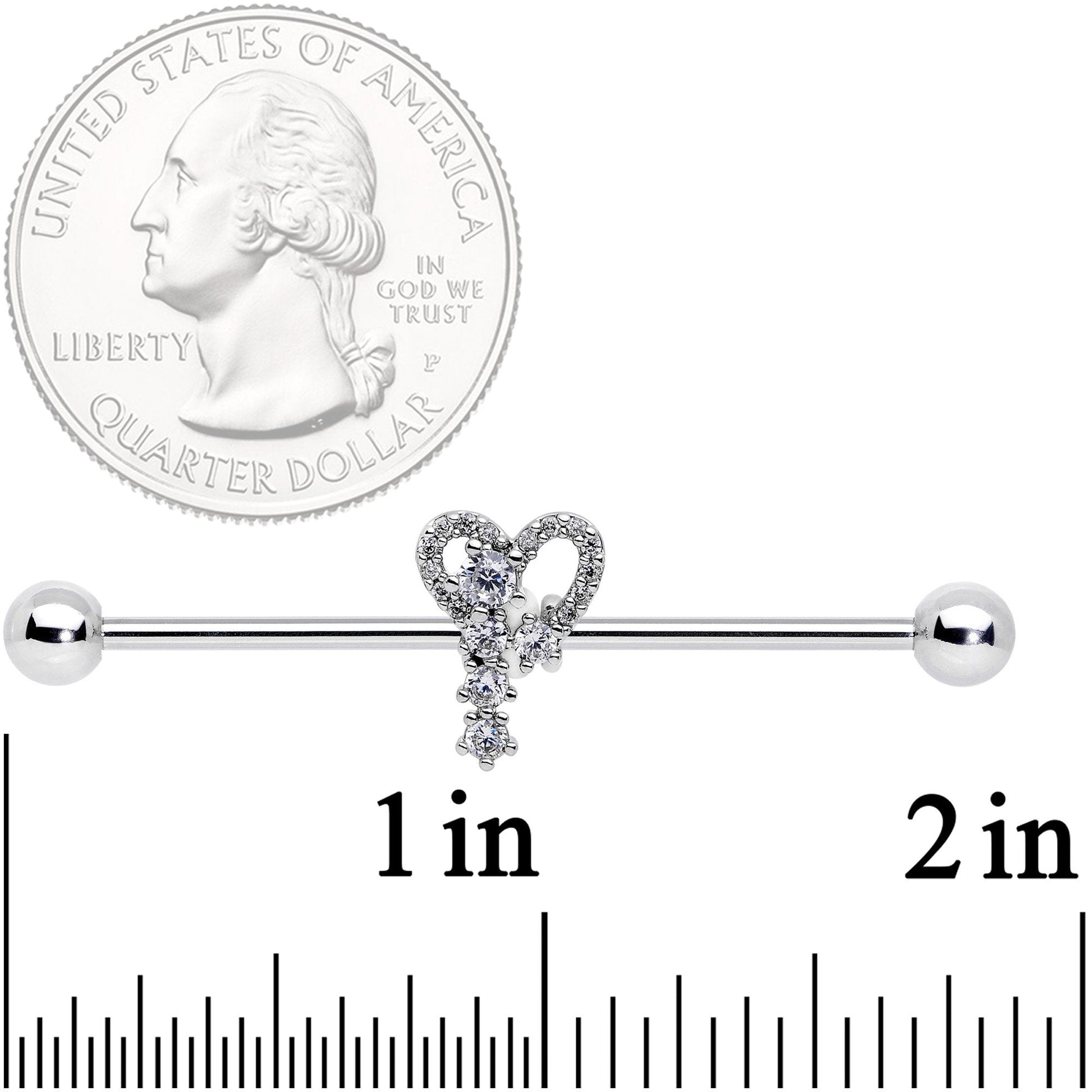 Get ready for Valentine's Day anytime you wear this pretty 14 gauge industrial piercing. Made with a 1 1/2" durable 316L surgical grade stainless steel straight barbell, this industrial piercing features a moveable heart charm formed with clear cubic zirconia gems that features a line of clear gems that hang from the heart.Specifications