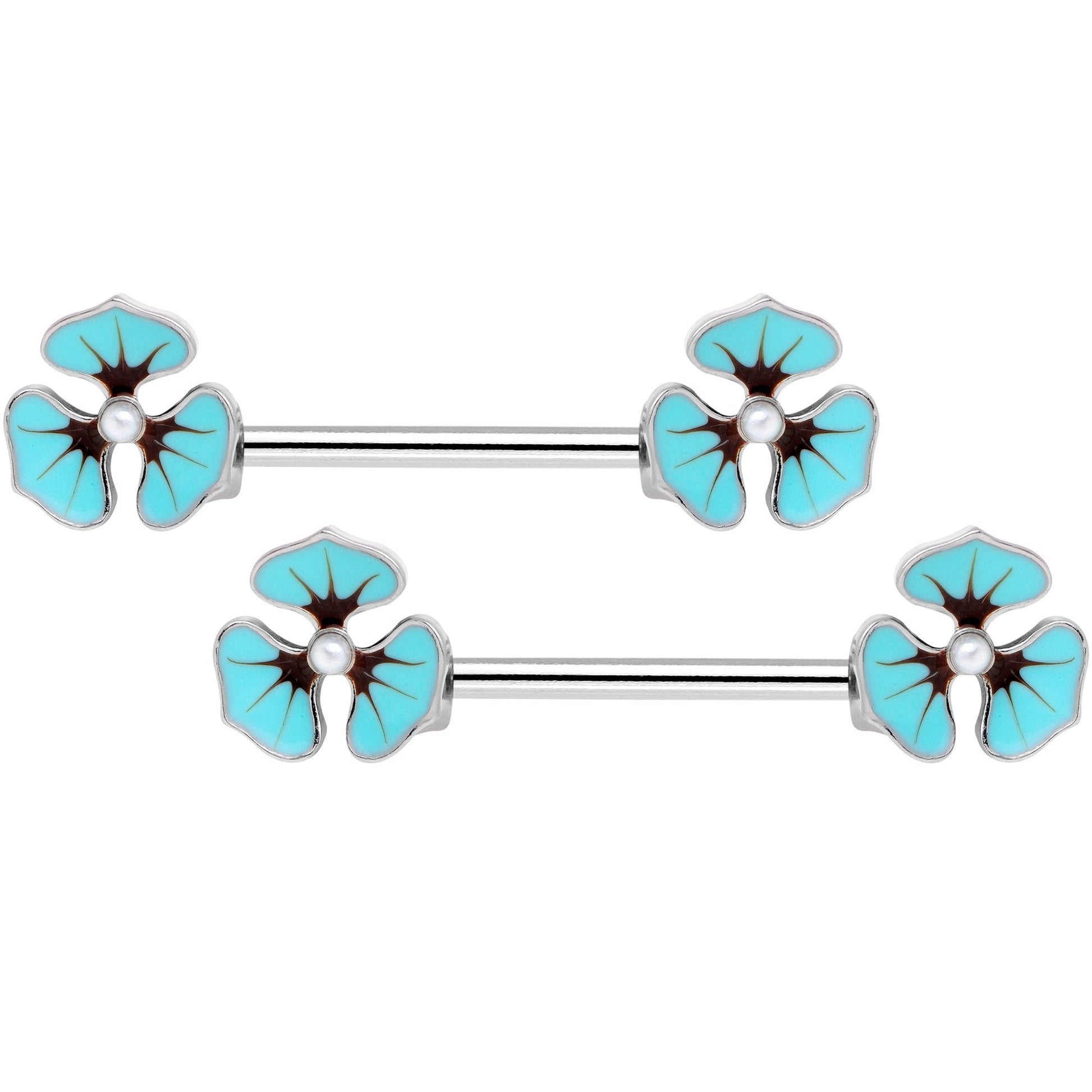 With winter on its way out, flowers are poking their heads up everywhere - even in your piercings! With this set of 14 gauge nipple jewelry, you get a pair of 9/16" durable 316L surgical grade stainless steel straight barbells. These are tipped with blue pansy ends with black detailing on the petals and tiny white orbs set at their center. You also get a 1/2" set of durable 316L surgical grade stainless steel circular barbells. These have 5mm ball ends which are set with clear gems. Whether you love to let spring do its thing or you just fancy some flowers, this set of nipple jewelry has everything you need! Sold as a set of four.