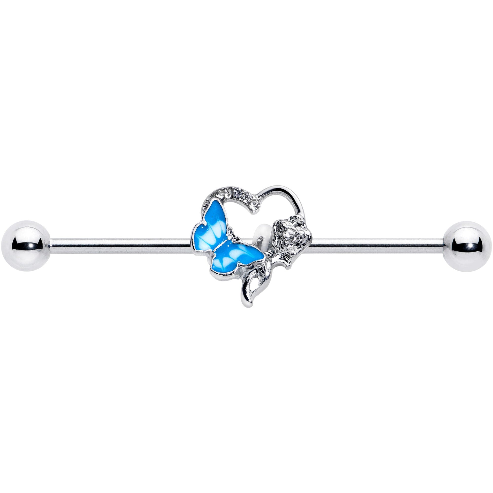 14 Gauge Clear Gem Butterfly Flower Blue Industrial Barbell 38mm