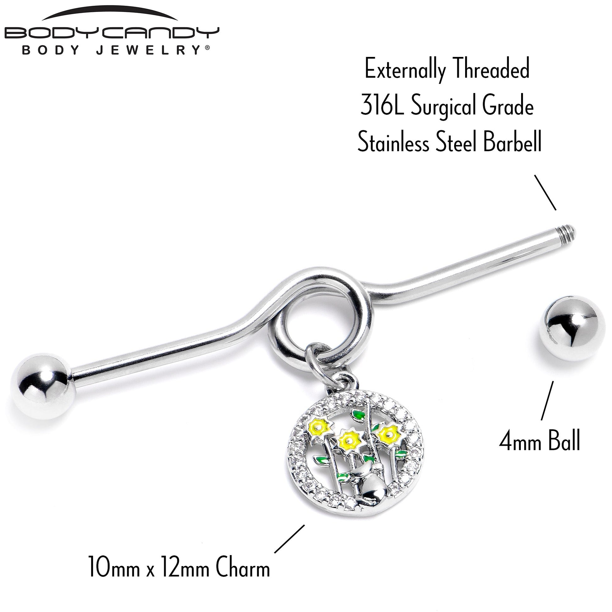What a beautiful place for this cat to hang out, on this 14 gauge helix barbell! It's made with a 1 1/2" durable 316L surgical grade stainless steel project barbell with 5mm ball ends. It features a loop in the center that supports a circle of clear gems charm with a field of yellow flowers inside. Sitting in the field is a simply detailed cat, who appears to be enjoying the beautiful scenery. Your industrial piercing will enjoy this floral field as much as this sweet kitty when you wear this fabulous floral helix barbell.Specifications