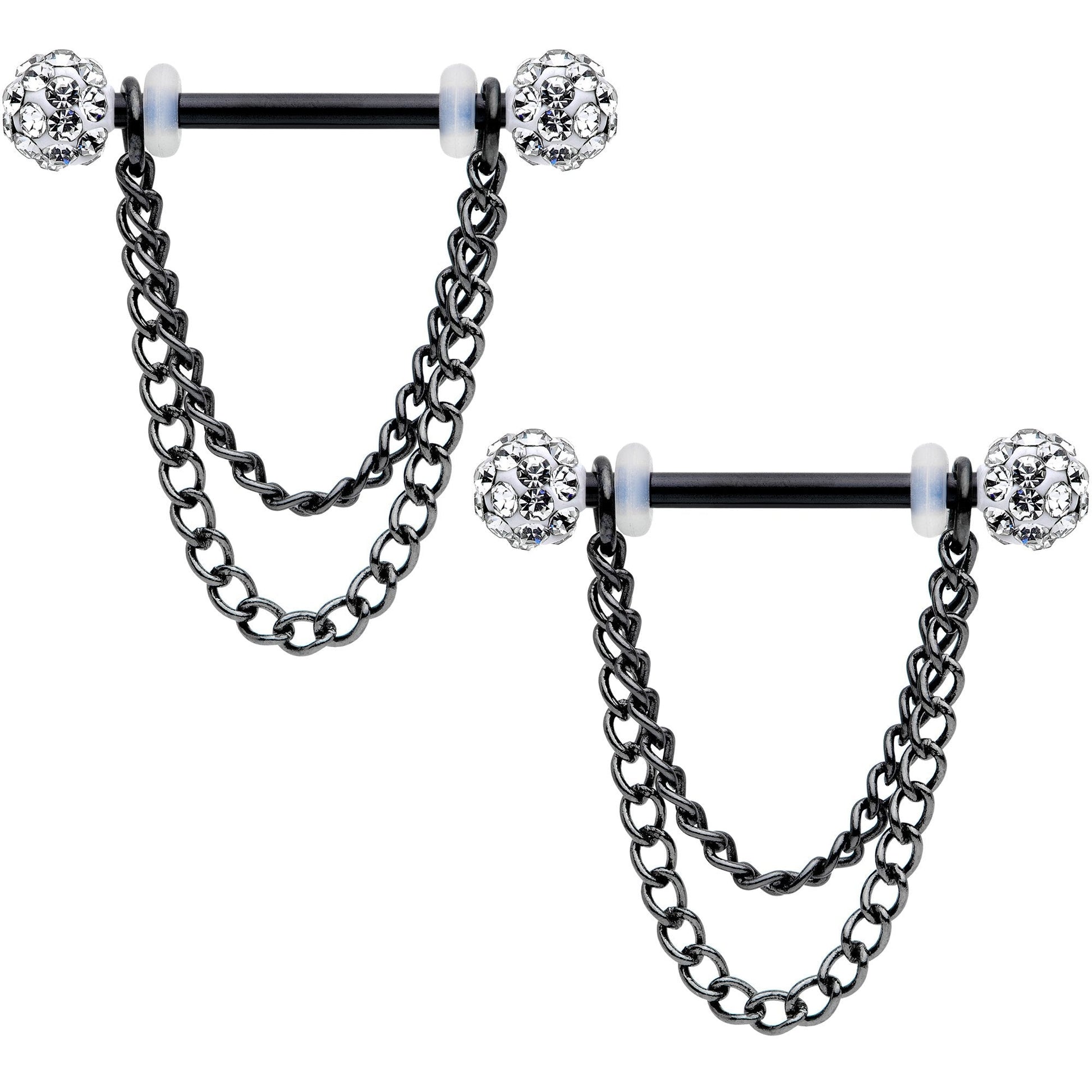 Don't look now but if you want your breasts to look their best this pair of 14 gauge nipple jewelry is just right! Made with 5/8" black plated over 316L surgical grade stainless steel straight barbells, these nipple piercings feature clear gem paved ball ends and sexy double chain dangles for eye-catching movement. Sold as a set of two.Specifications