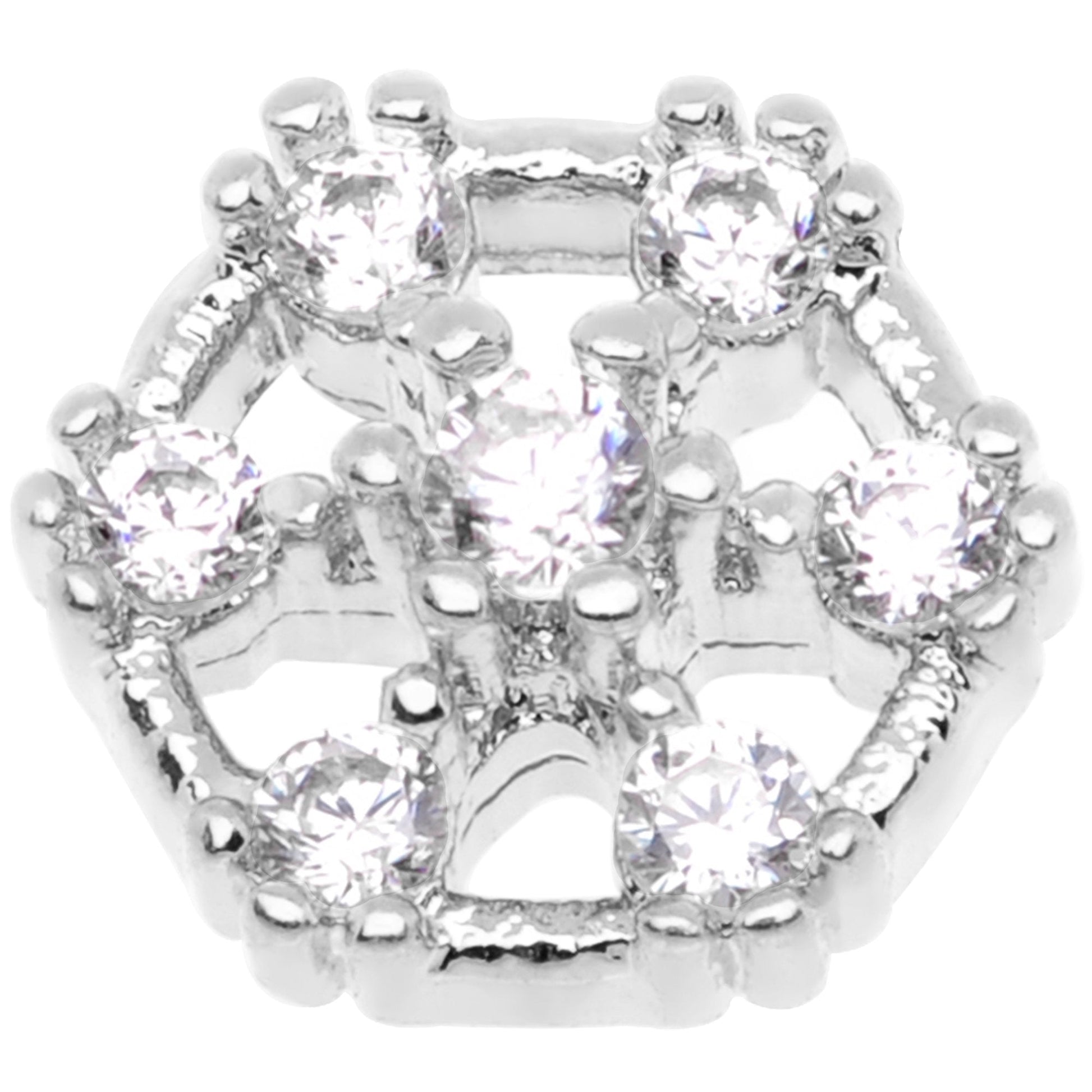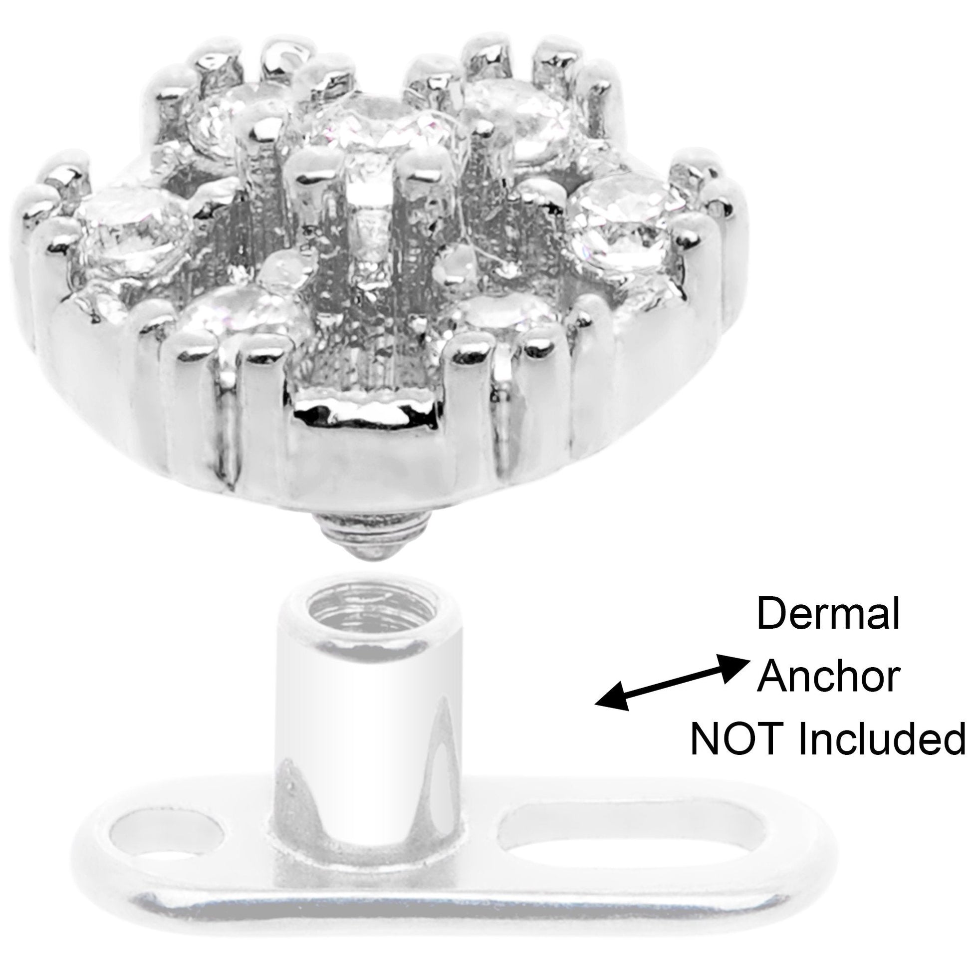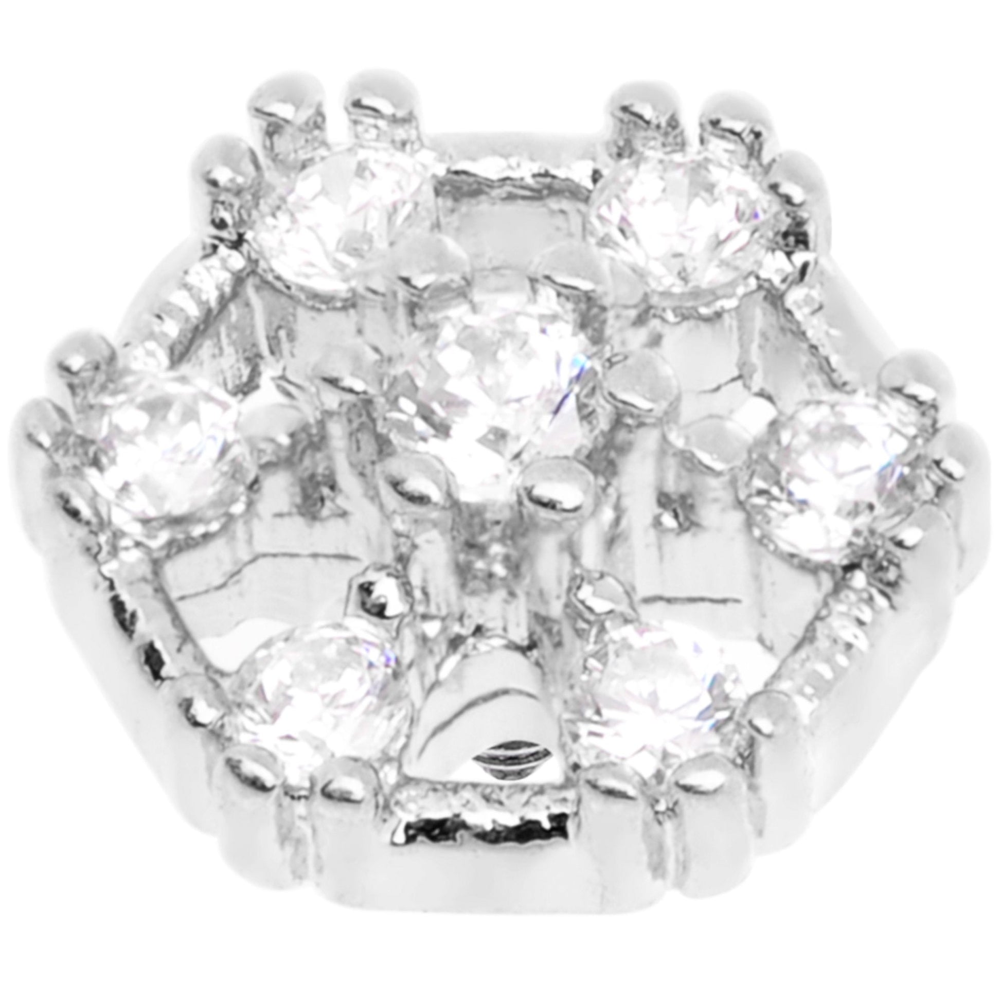 Looking to add some flair to your surface piercing? This dermal top is bursting with flair, with a 5.5mm hexagon top set with clear gems as its surface. This dermal top features a 14 gauge externally threaded dermal screw made with durable 316L surgical grade stainless steel, which screws into your surface anchor. Anchor not included.Specifications