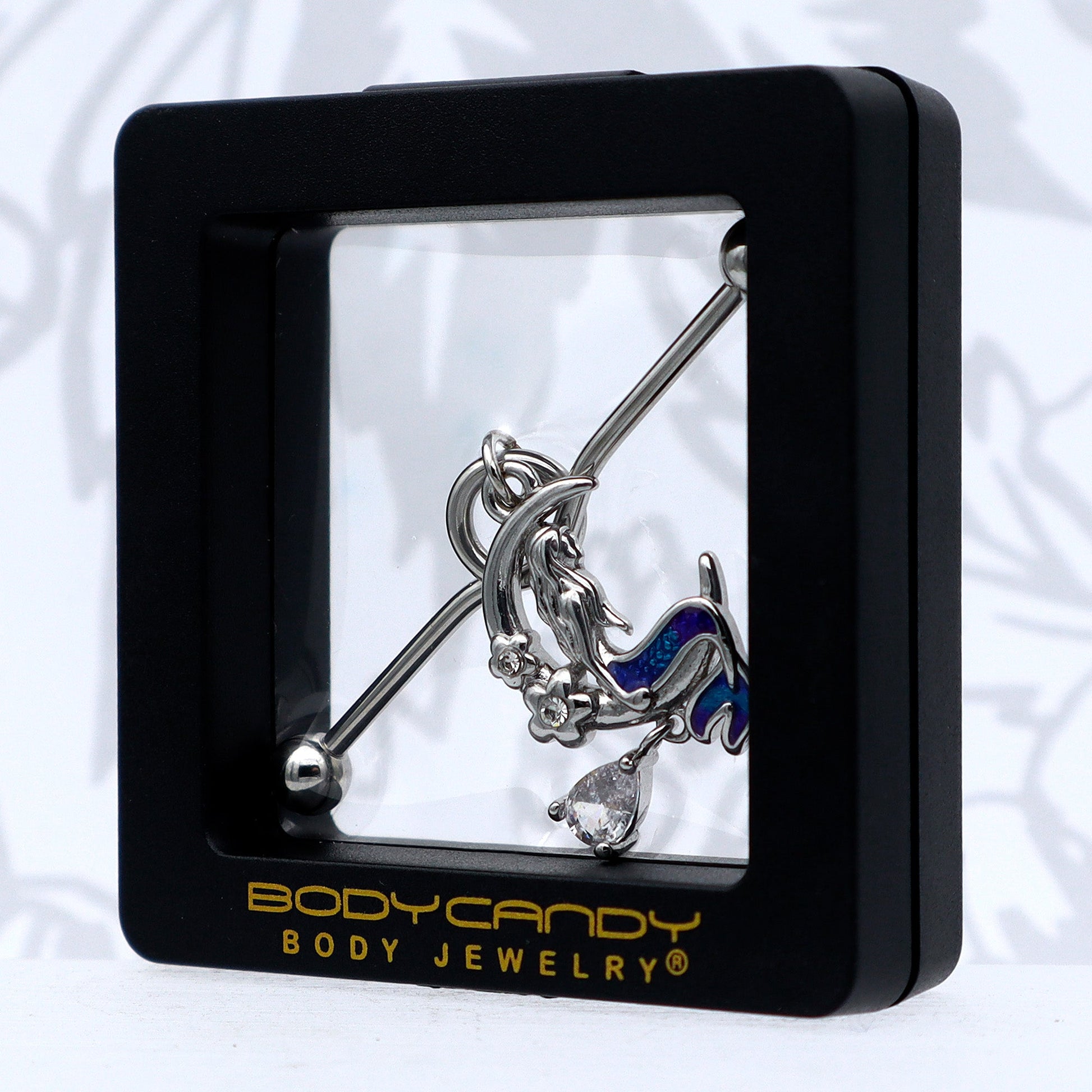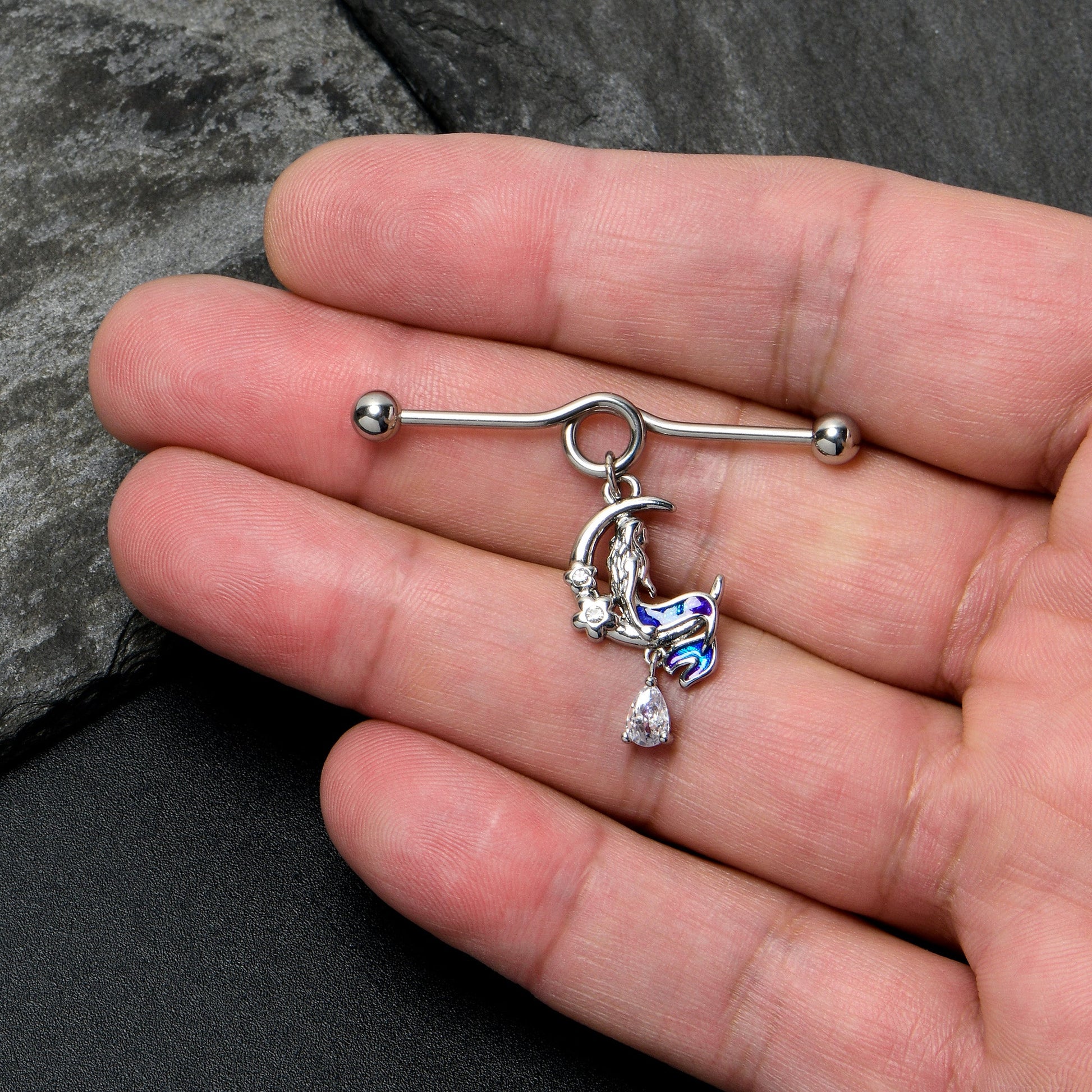 Ride the night like the mermaid on this 14 gauge helix barbell. It is made with a 1 1/2 inch 316L surgical grade stainless steel project bar with 5mm ball ends. The barbell has a loop in the center. Dangling from the loop is a moon charm, with floral embellishments on the side. Perched on the moon is a mermaid, with blue inlay tail. Dangling from the mermaid is a clear gem, for added motion and style. You will be over the moon when you are rocking this magnificent mermaid barbell earring.Specifications