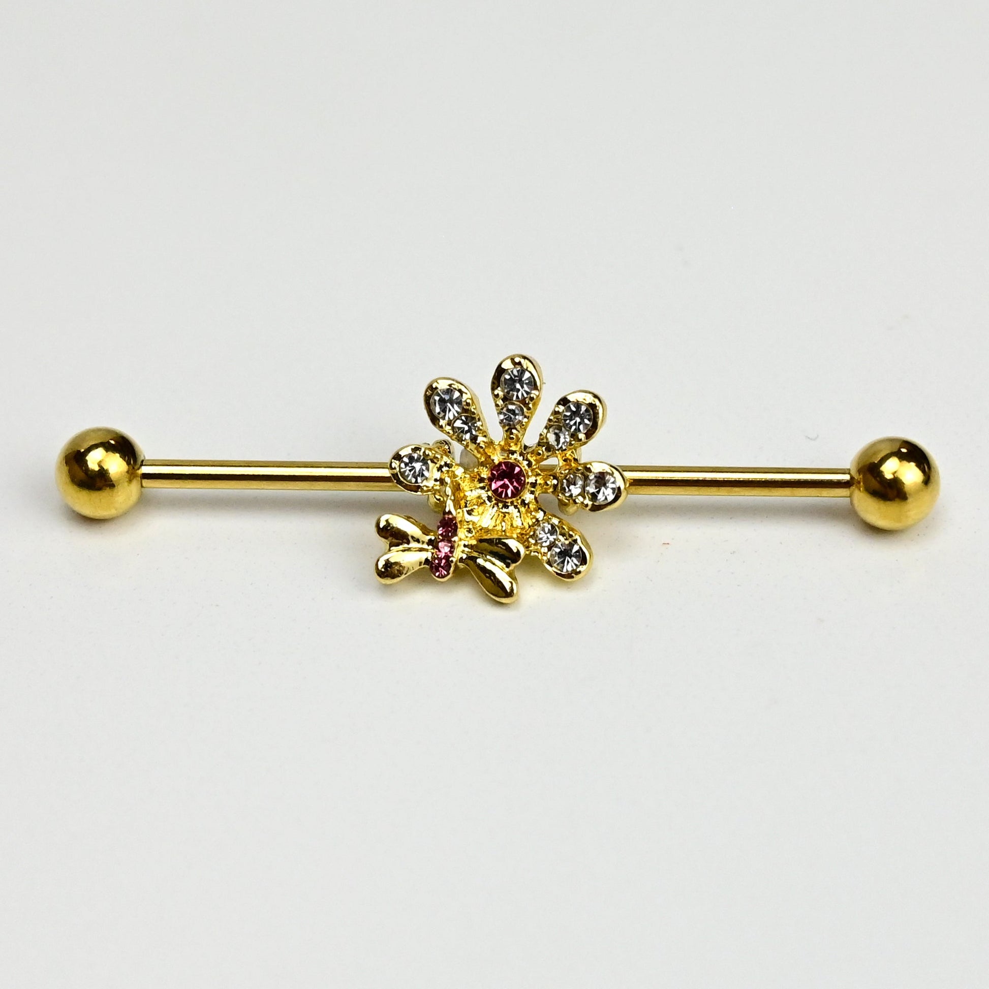 What could be more timeless than butterflies and flowers, like on this 14 gauge helix barbell? It is made with a 1 1/2 inch gold tone PVD over 316L surgical grade stainless steel straight barbell with 5mm ball ends. It features a floral charm, with the petals paved with clear gems and a pink gem center. Dangling beneath is a simple butterfly with pink gems set into the body. You can even slide it up and down the length of the barbell for the perfect look. You will be feeling butterfly beautiful when you are rocking this classic barbell earring.Specifications