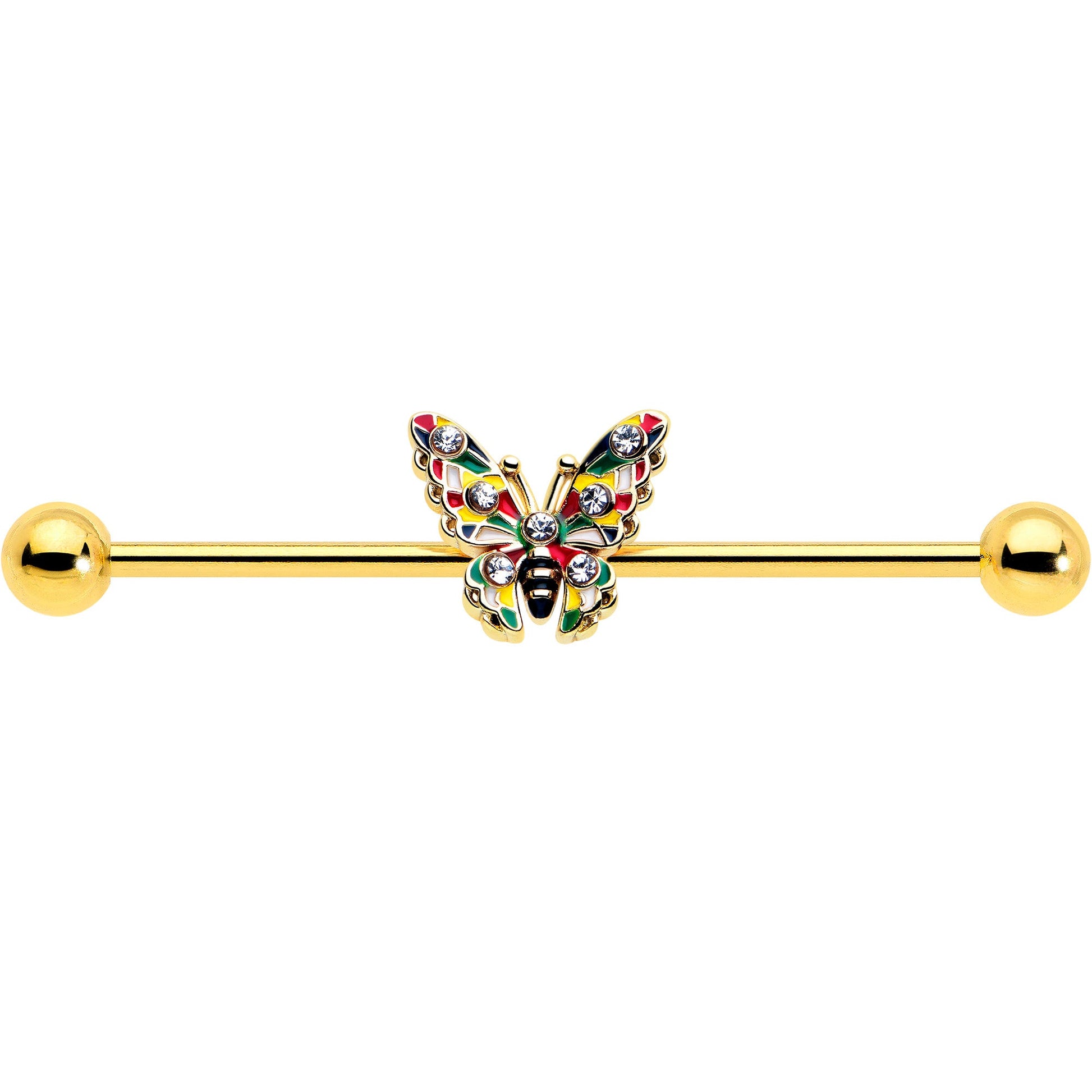 14 Gauge Clear Gem Gold Tone Color Block Butterfly Industrial Barbell 38mm