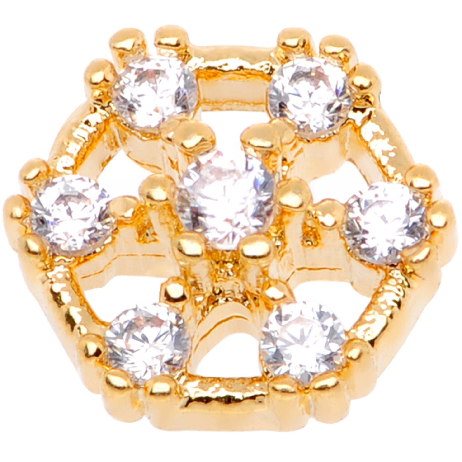 Looking to add some flair to your surface piercing? This dermal top is bursting with flair, with a 5.5mm hexagon top set with clear gems as its surface. This dermal top features a 14 gauge externally threaded dermal screw made with durable 316L surgical grade stainless steel, which screws into your surface anchor. Anchor not included.Specifications