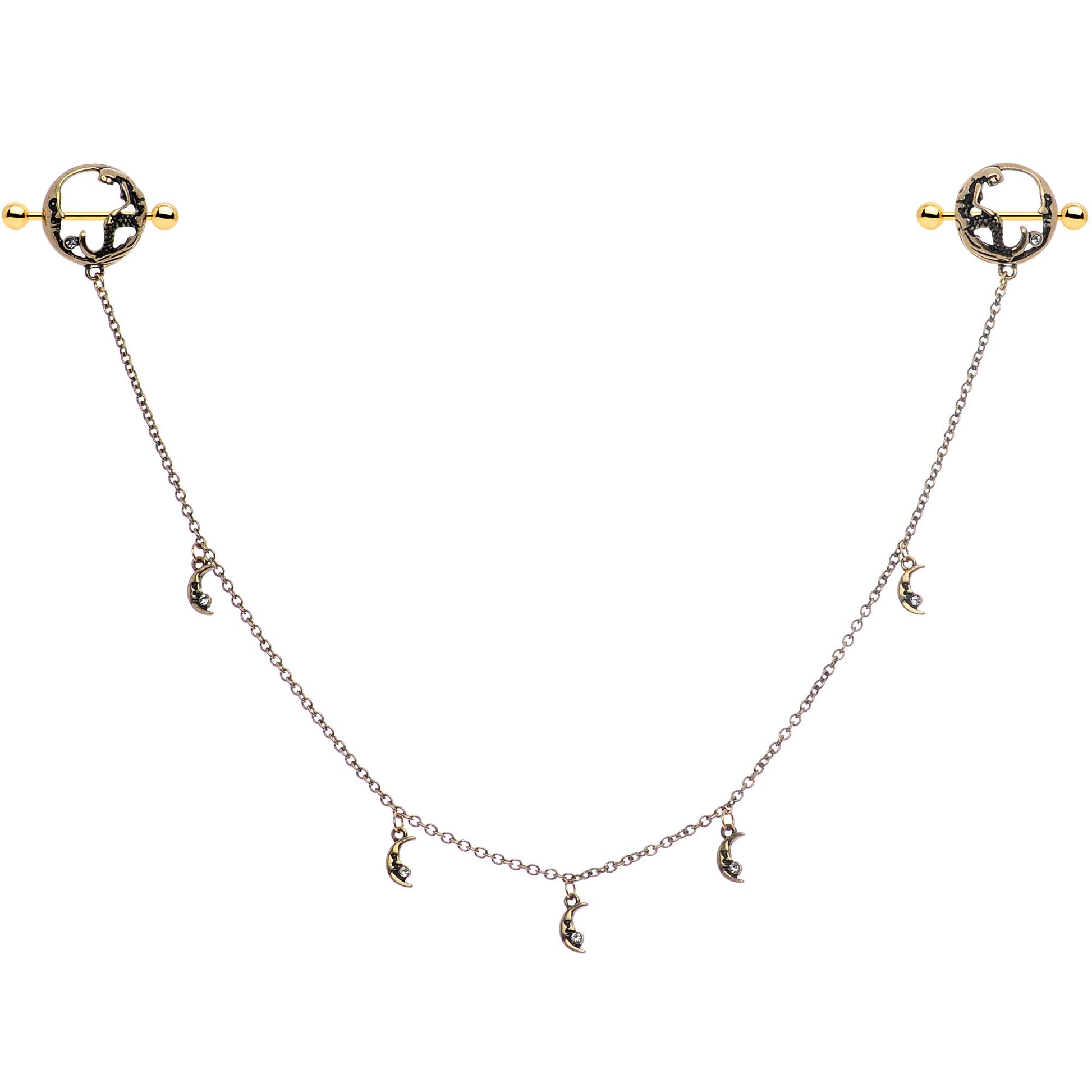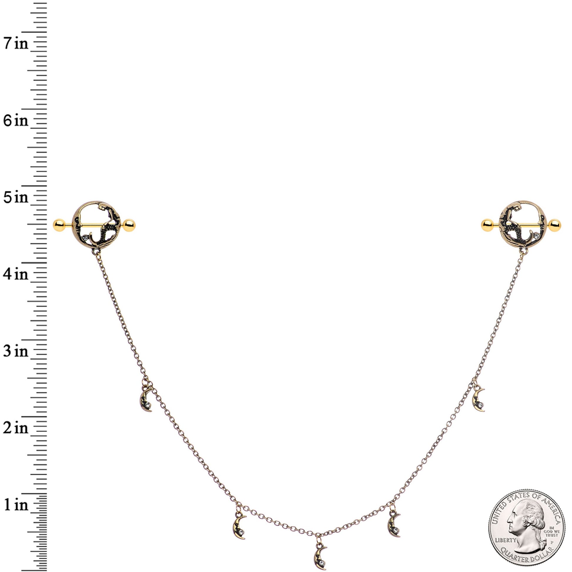You'll love the mermaid on the moon that you'll get with this 14 gauge nipple jewelry! It's made with 9/16" gold tone PVD over 316L surgical grade stainless steel straight barbells with 5mm ball ends. The shields feature crescent moons on one side with serene faces and clear gems set on the lower curves. The other side of the shields are mermaids, with textured detailing of her scales. Between the two hangs a 12" length of chain which supports several matching crescent moon charms, each set with a small clear gem. You're going for a look that's nautical or celestial, this beautiful nipple chain has you covered!Specifications